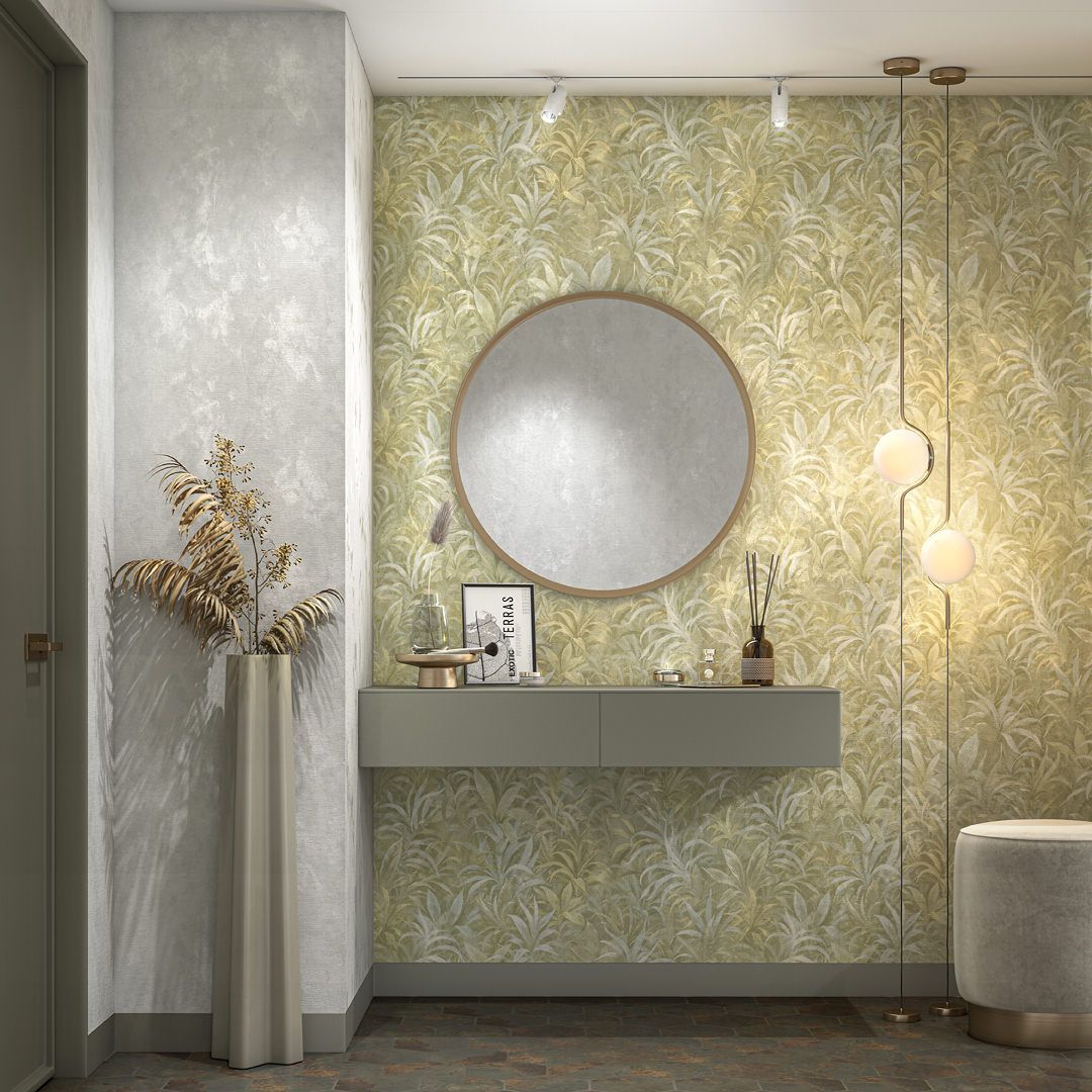 Фоновые обои представлены в линейке с тем же фоновым тиснением. Матовая поверхность мотива и фона смотрится очень естественно.