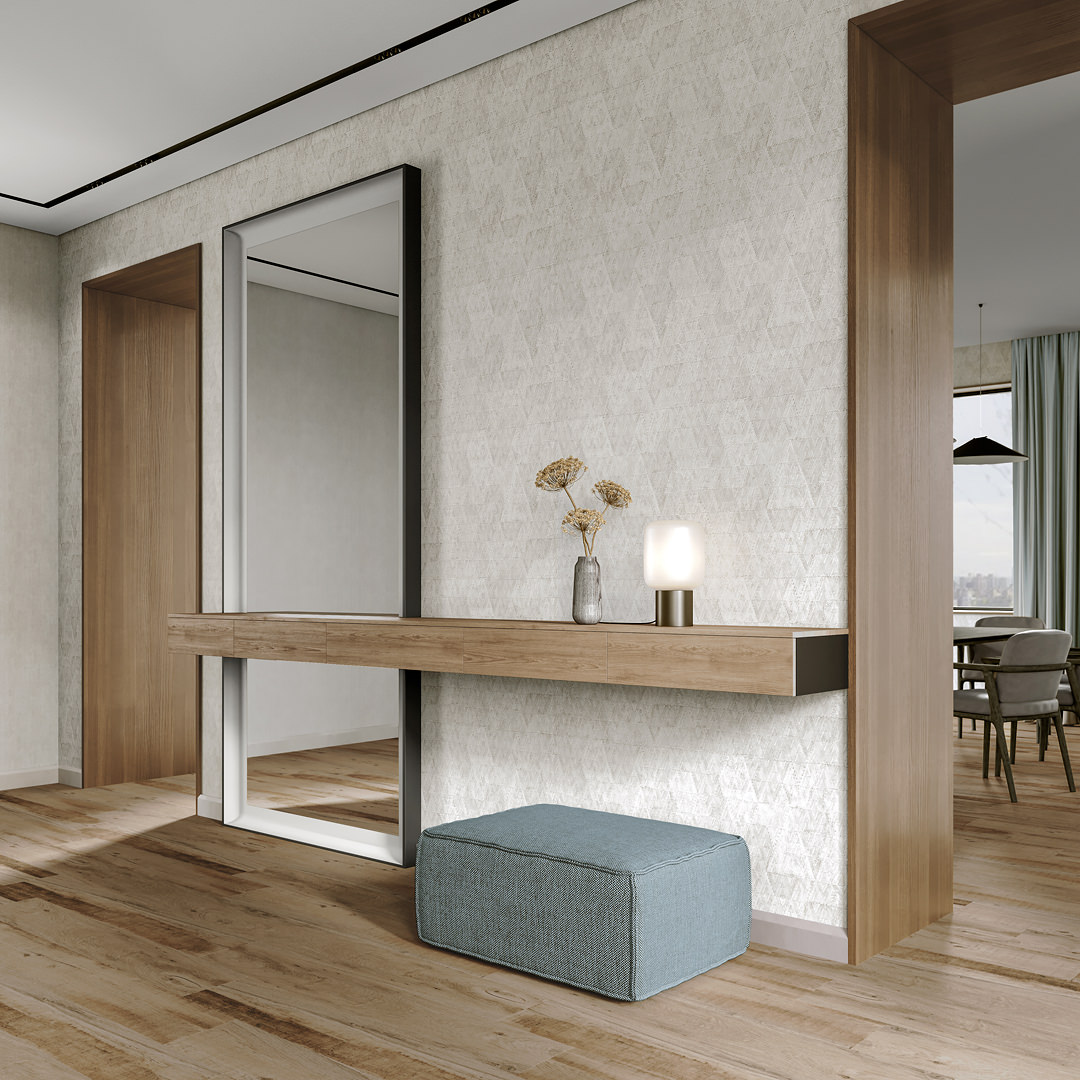Эффект металлического блеска достигнут за счёт применения перламутра на более светлых рулонах и золота — на мотивах с более глубоким цветом. Тиснение придаёт покрытию объём и делает стильный геометрический рисунок по-настоящему выразительным.