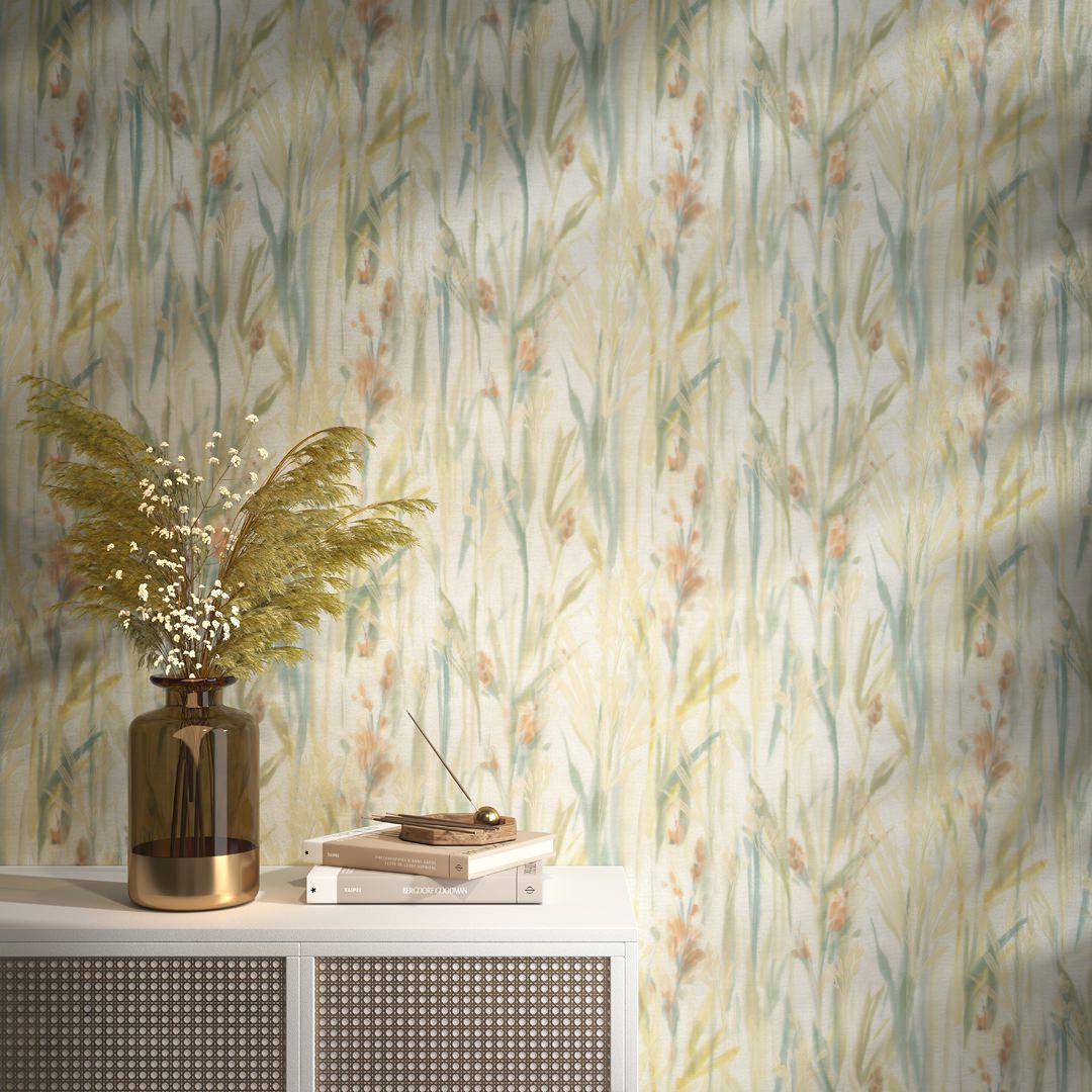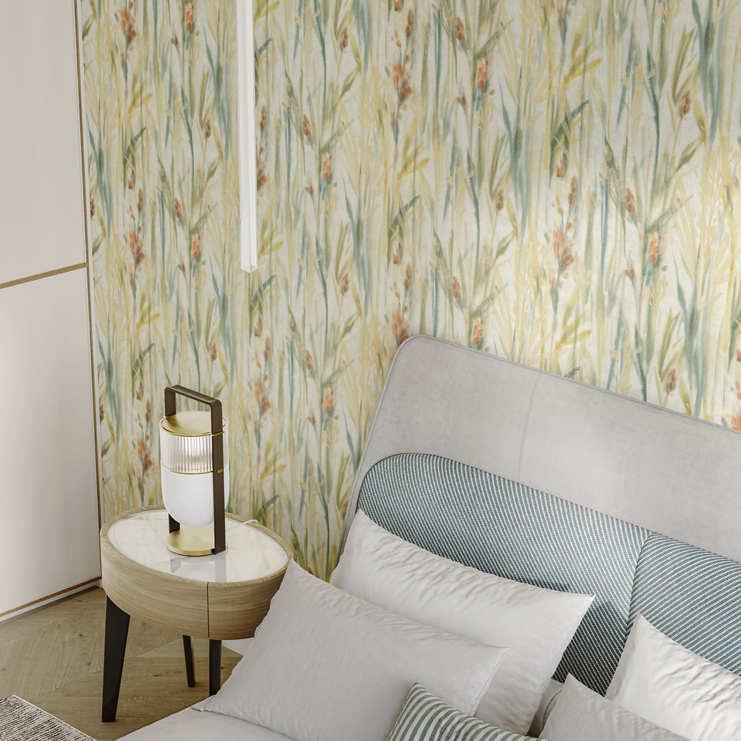 Флористический сюжет мотивов решён в акварельной стилистике. Фантазийные цветы, похожие на гладиолусы, на стене образуют живописное поле в цветовой гамме, содержащей несколько оттенков. Помимо артикулов со светлым фоном, в серии есть и более насыщенные варианты, в том числе с сиреневыми тонами: они созвучны палитре раннего утра или подёрнутых туманом сумерек. Все обои представлены в матовом исполнении.