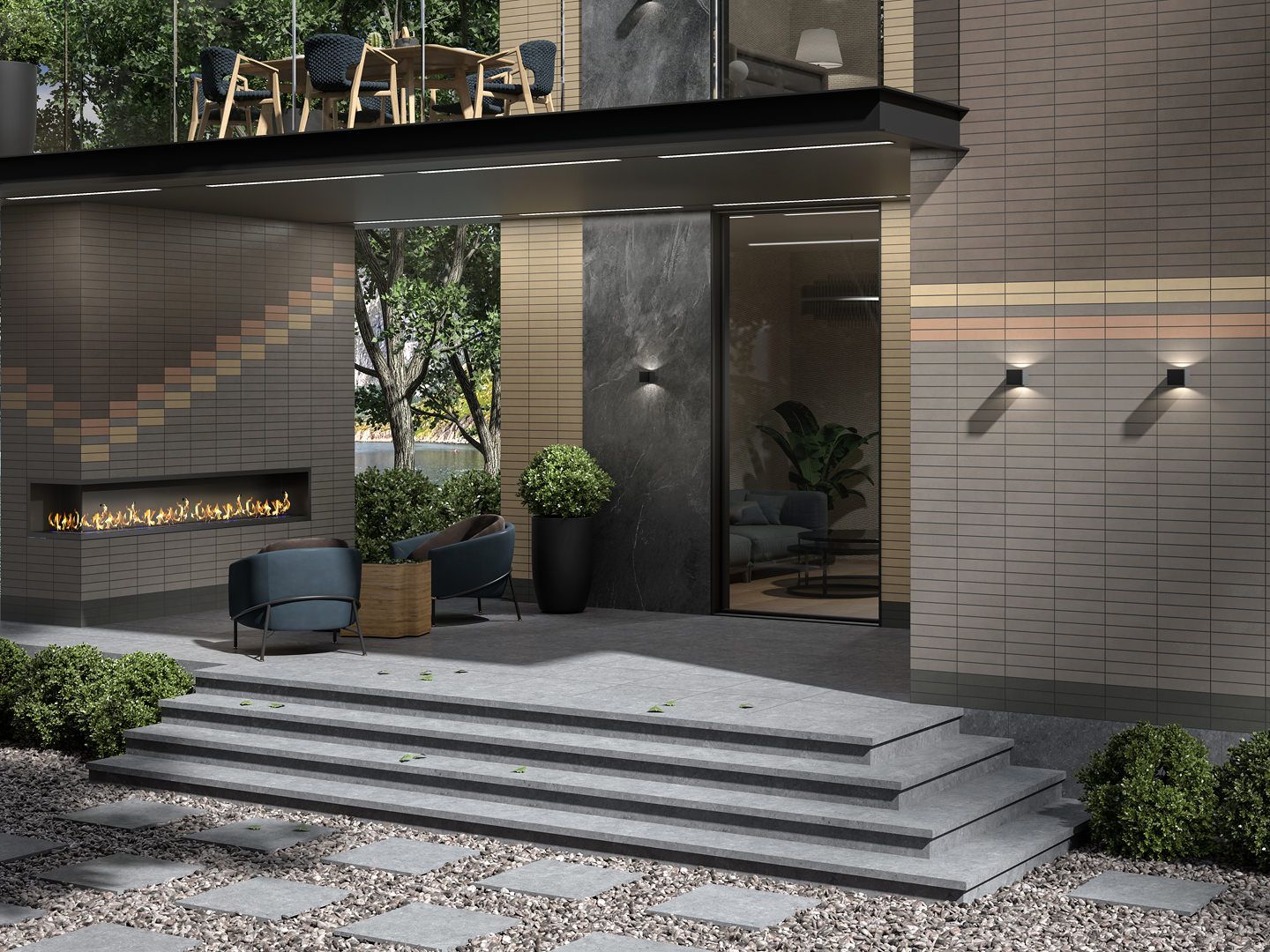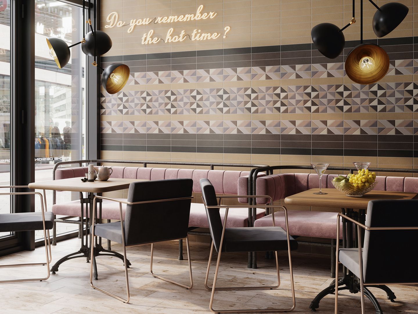 Фоновая плитка предлагает здесь актуальную гамму пастельных цветов с лёгкой структурой кирпича. Декоры дополняют основную палитру и содержат стильный геометрический рисунок: некоторые из его частей покрыты полупрозрачной гранилью. Необычная выкладка из декоративных элементов станет настоящим украшением интерьера.