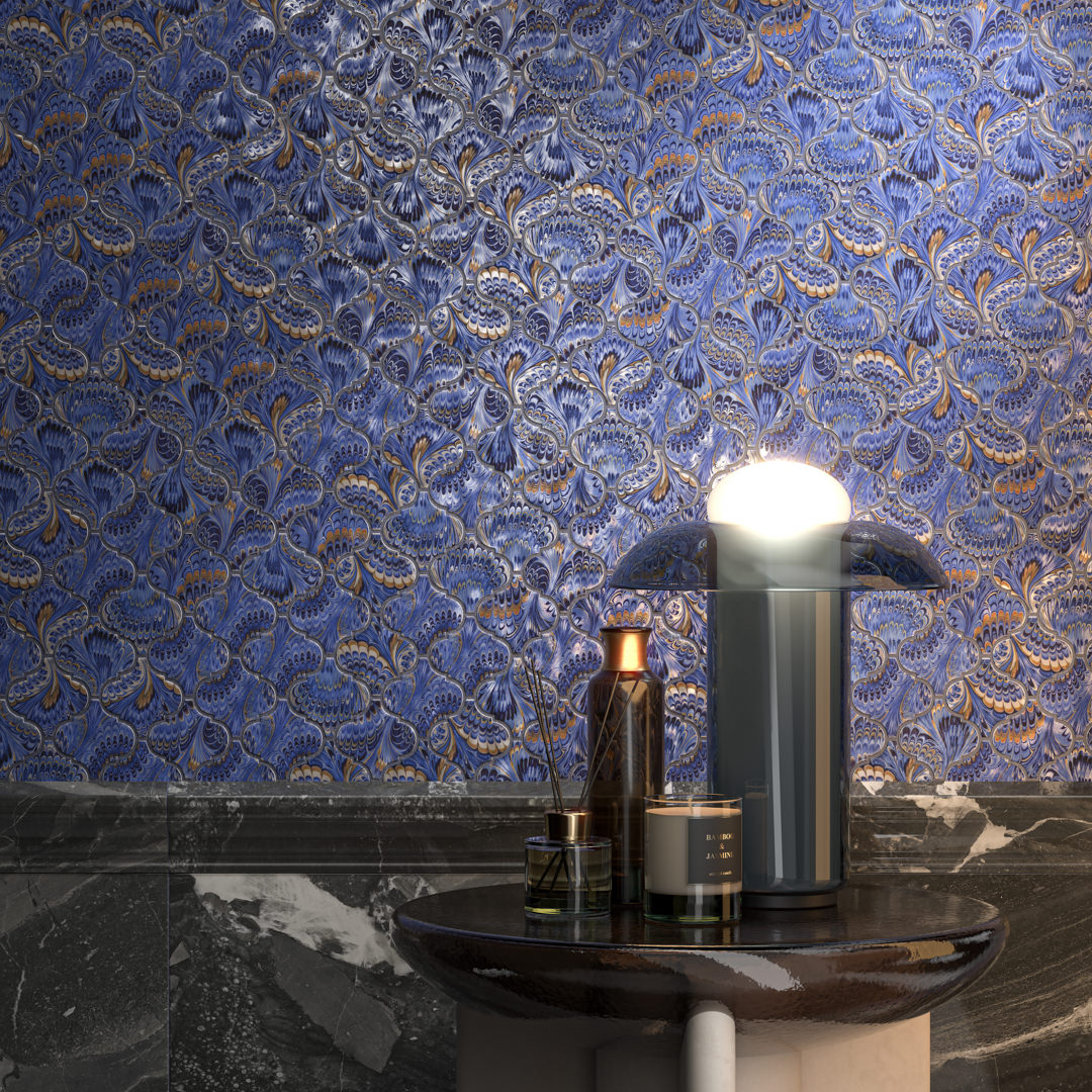 Впервые появившись в коллекции 2019 года, арабески полюбились многим дизайнерам интерьеров, которые наверняка оценят расширение декоративных возможностей этой самобытной мозаики. В новых декорах воспроизводится эффект мраморной бумаги, относящейся к числу традиционных венецианских сувениров.