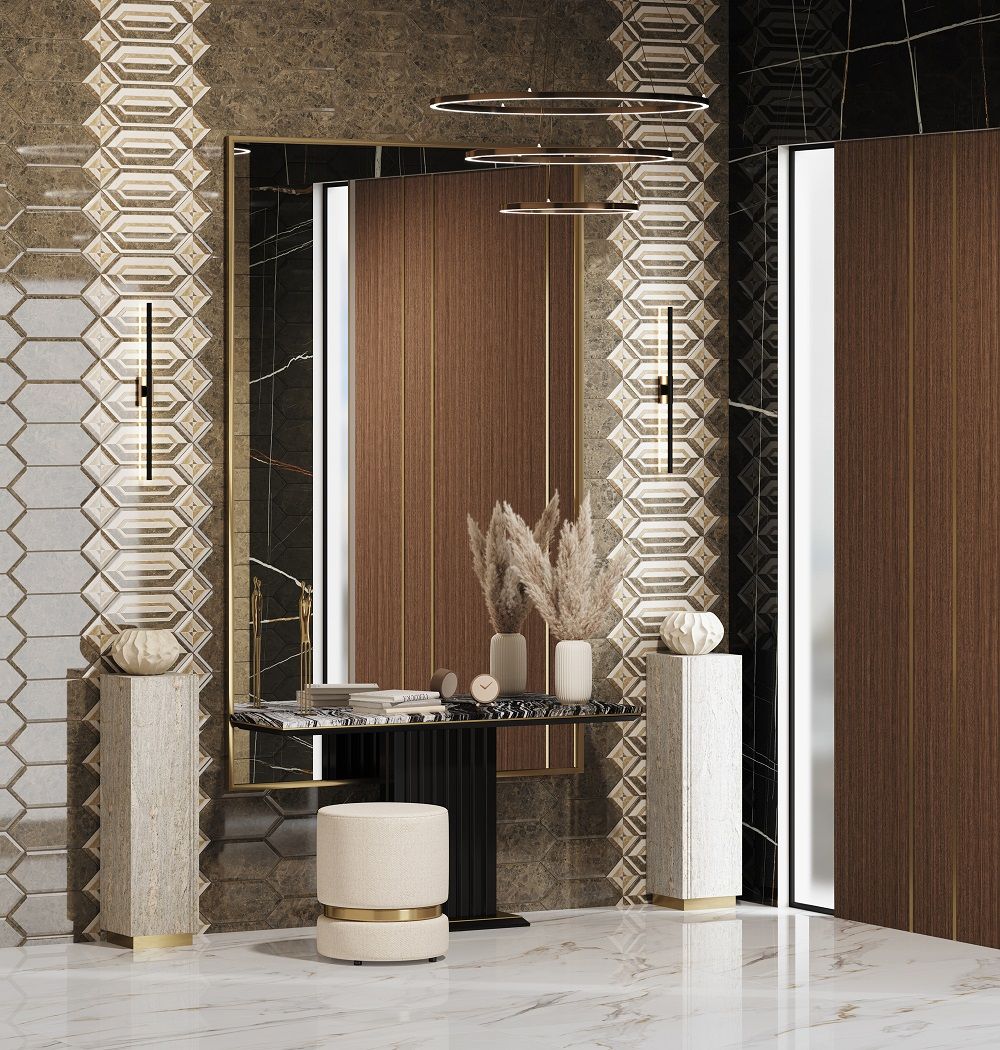 Вместе с декорами и вставками новый шестиугольный формат даёт настоящую свободу для создания интересных раскладок. На стене плитка под мрамор может быть ориентирована горизонтально, вертикально и по диагонали — а если площадь керамической композиции достаточно велика, в ней можно будет использовать сразу несколько вариантов укладки.