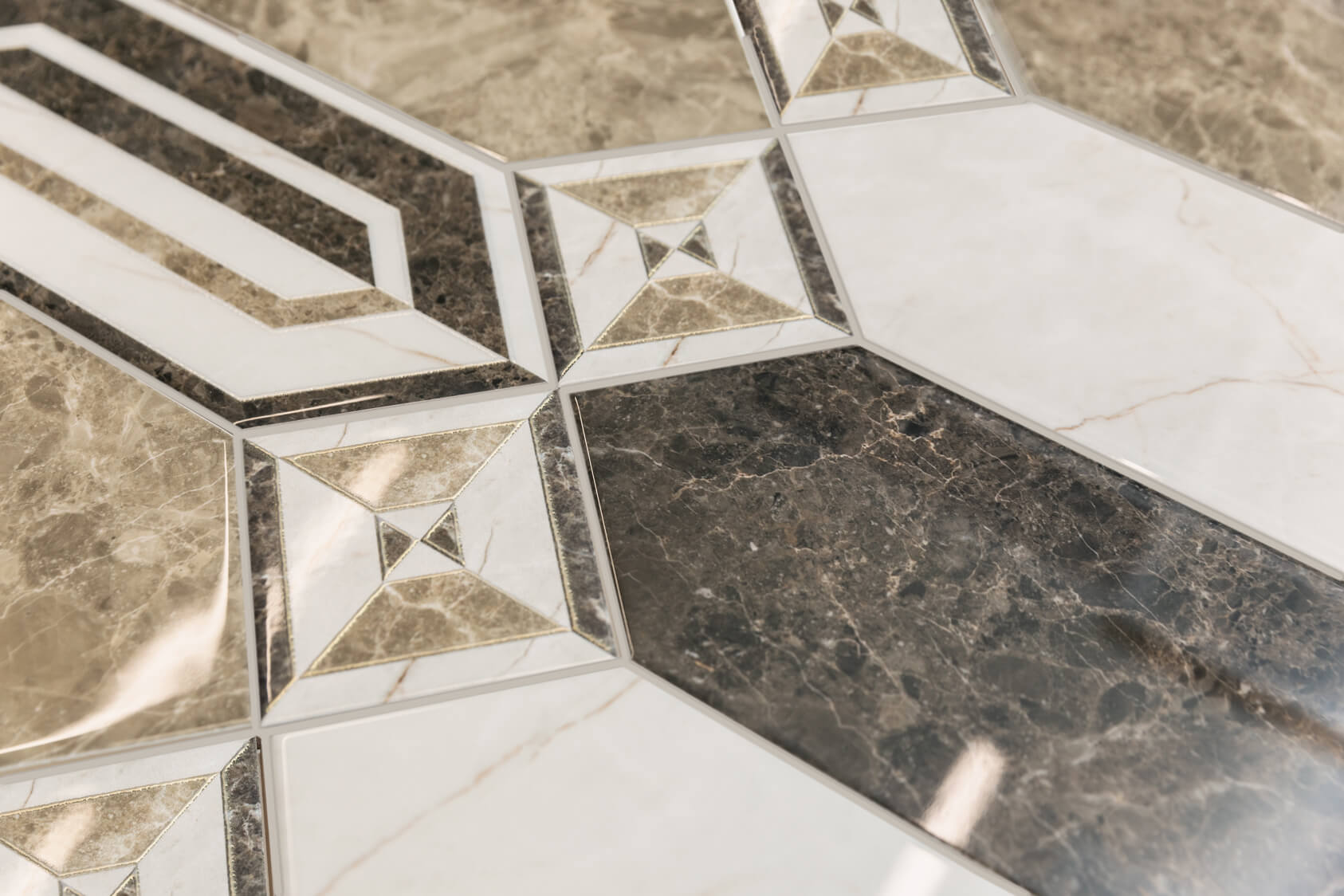Тёмный и светлый бежевый, а также коричневый цвета базовой плитки соединяются в декорах, напоминающих стильную геометрическую инкрустацию из нескольких видов мрамора. Поверхность декоров украшает тонкая окантовка основного рисунка, выполненная при помощи золотистого состава. Настенную раскладку также можно дополнить изящными квадратными вставками со структурой «диамантато».