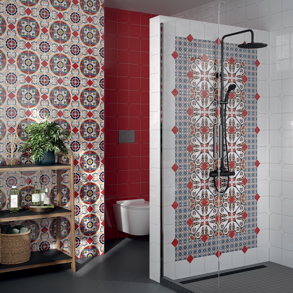 Вместе с декорами «Болао» в керамической композиции можно использовать глянцевую однотонную плитку «Граньяно» белого и красного цветов. В интерьере будет отлично смотреться мебель в той же гамме, в том числе кухонная, с добавлением красного или синего текстиля на окнах.