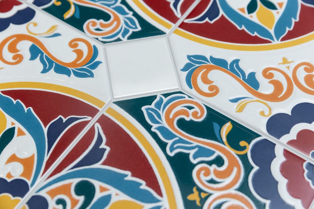 Четыре вида шестиугольных ярких плиток можно сложить в эффектные орнаментальные розоны. Особым украшением раскладки станут миниатюрные вставки «Клемансо», декорированные золотом. Используя однотонные и декорированные вставки, дизайнер волен создавать множество неповторимых вариантов симметричного узора или формировать повторяющийся паттерн из одинаковых «лепестков».