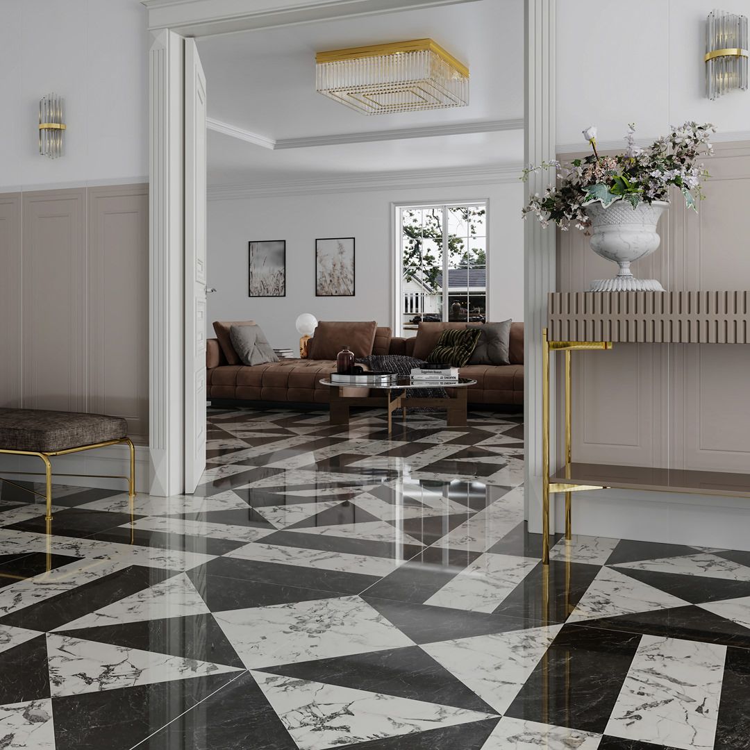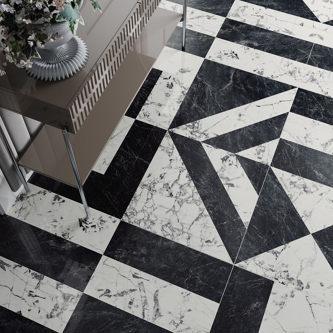 Сочетание белого и чёрного мрамора в крупном геометрическом орнаменте — смелое интерьерное высказывание, которое точно не останется без внимания. Этот выразительный дизайн вдохновлён отделкой миланских входных групп, справедливо считающихся одной из визитных карточек ломбардской столицы.