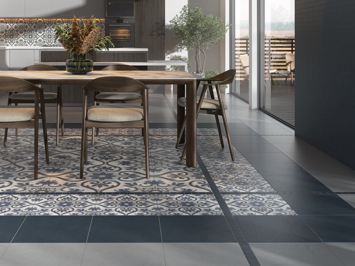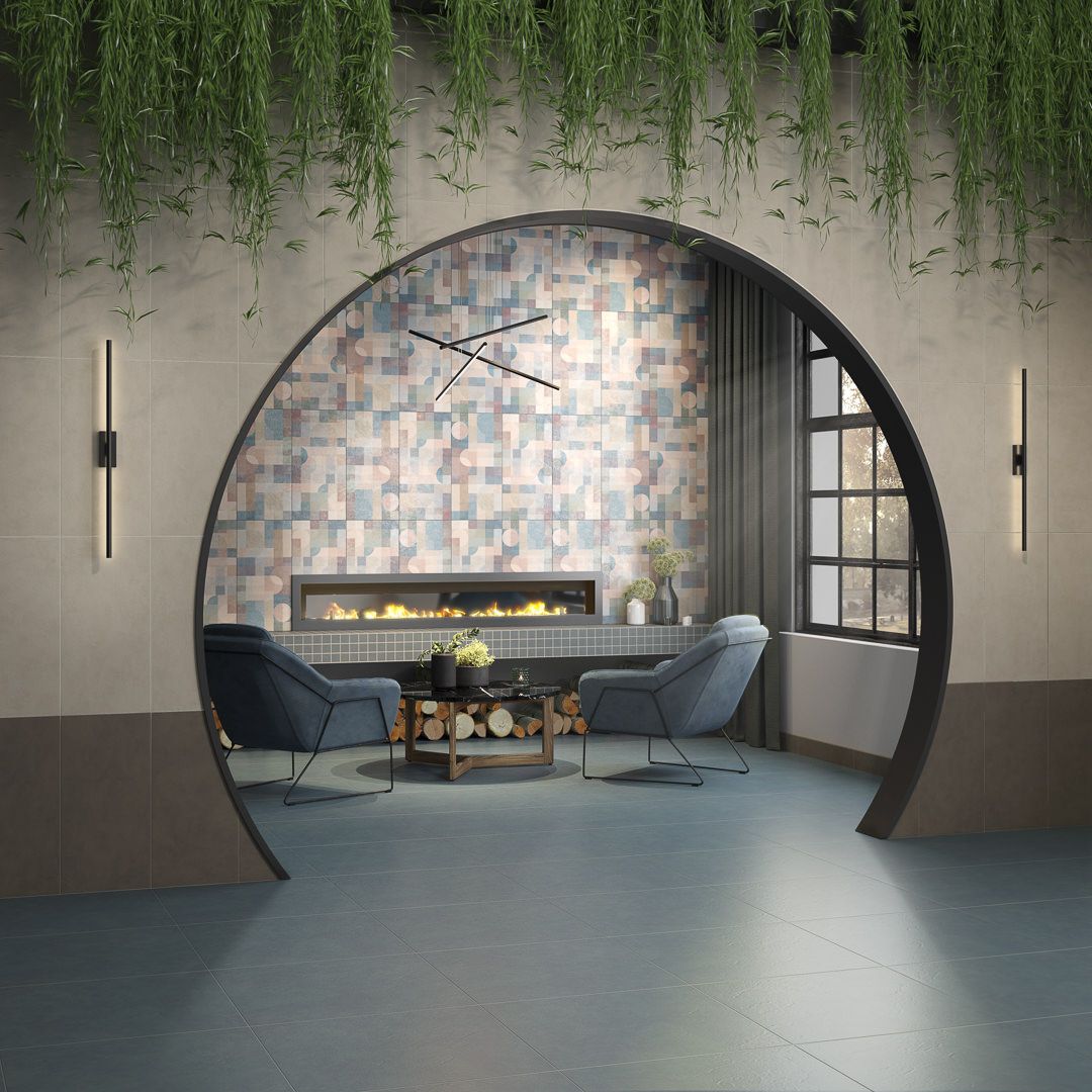 Серия «Чементо» объединила сразу несколько трендов в отделочной керамике: бетонную поверхность, геометрические орнаменты, а также разнообразие цветовых сочетаний и форматов.