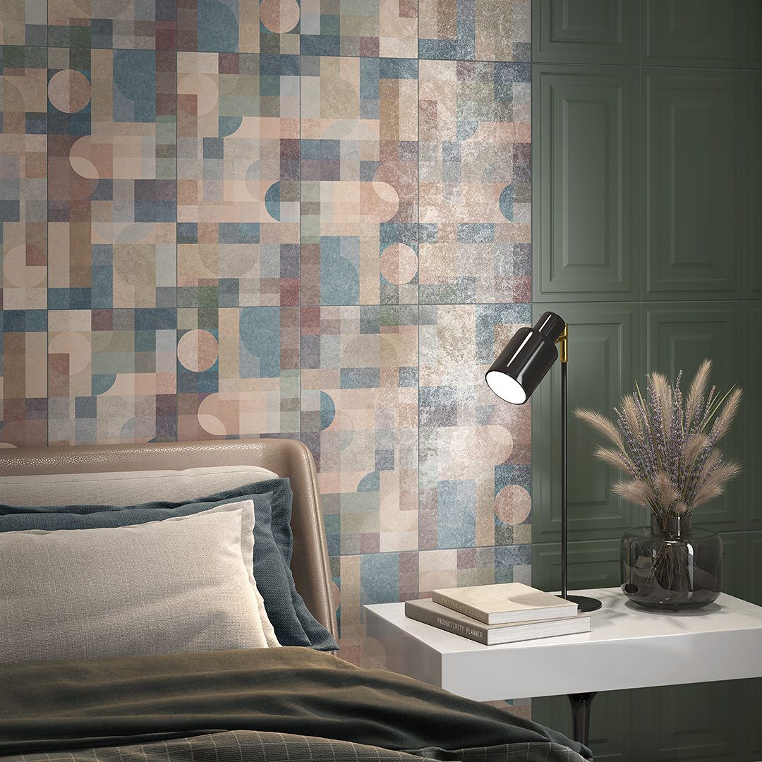 В серии представлены два варианта декоров. Геометрический узор в формате 30х60 содержит все цвета фоновой плитки. Он не только станет заметным акцентом, но и объединит гамму интерьера в стройный ансамбль. А вот декоративная плитка 20х20 см выполнена в технике «пэчворк». Для составления композиции можно выбрать один вид декора или использовать раскладку из нескольких элементов.