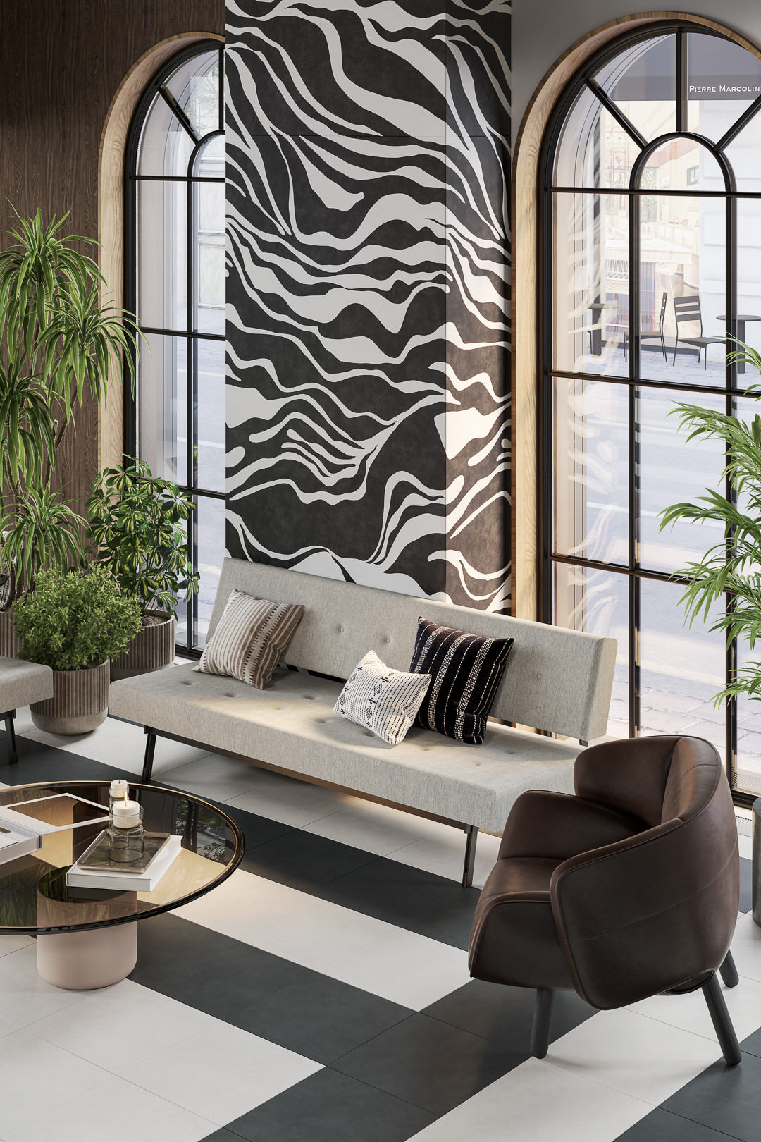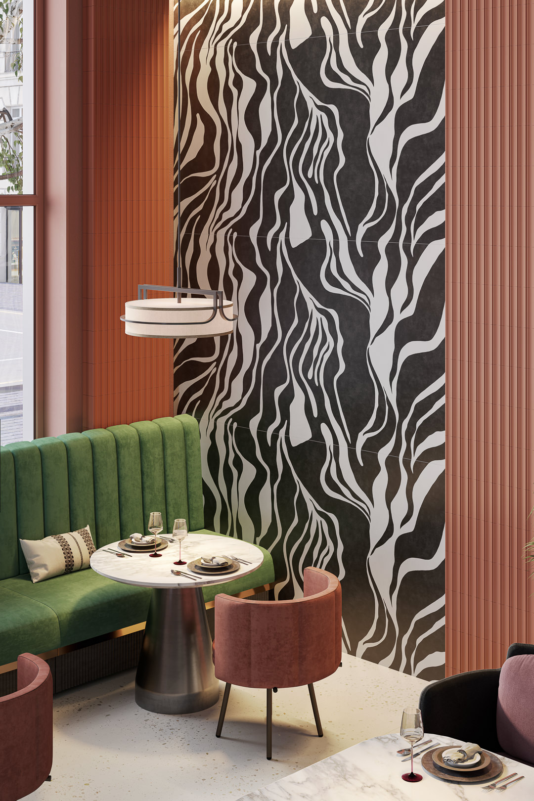 Контрастный рисунок, созданный самой природой, нашёл отражение в керамическом ковре «Джебель». Его монохромный узор перекликается не только с суровой красотой горных массивов, но и с естественными текстурами животного мира Марокко: в рисунке угадываются анималистические мотивы, напоминающие полоски на шкуре зебры.