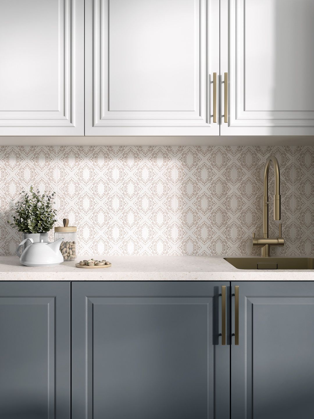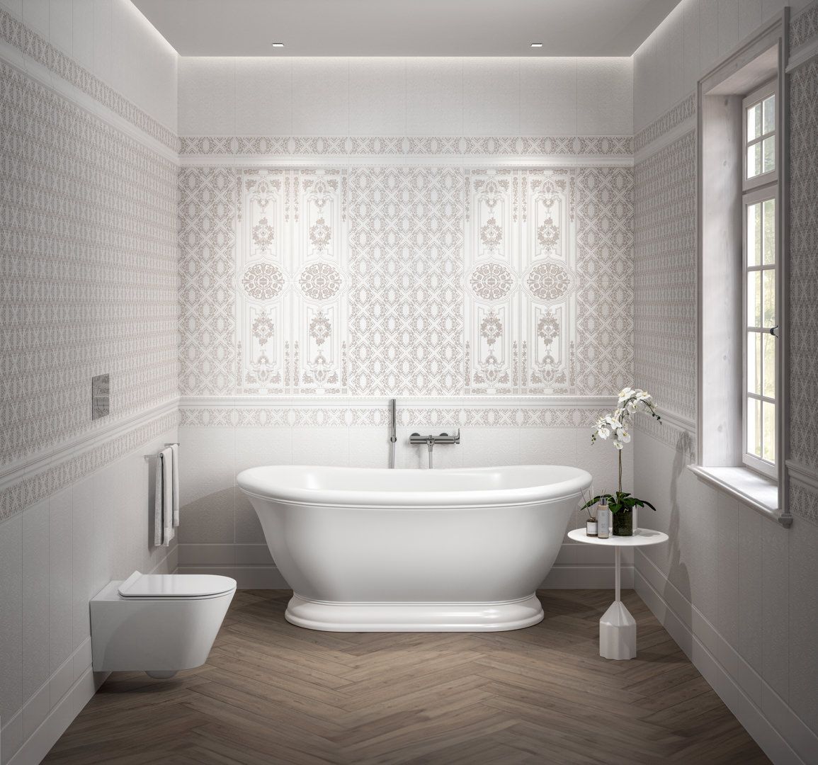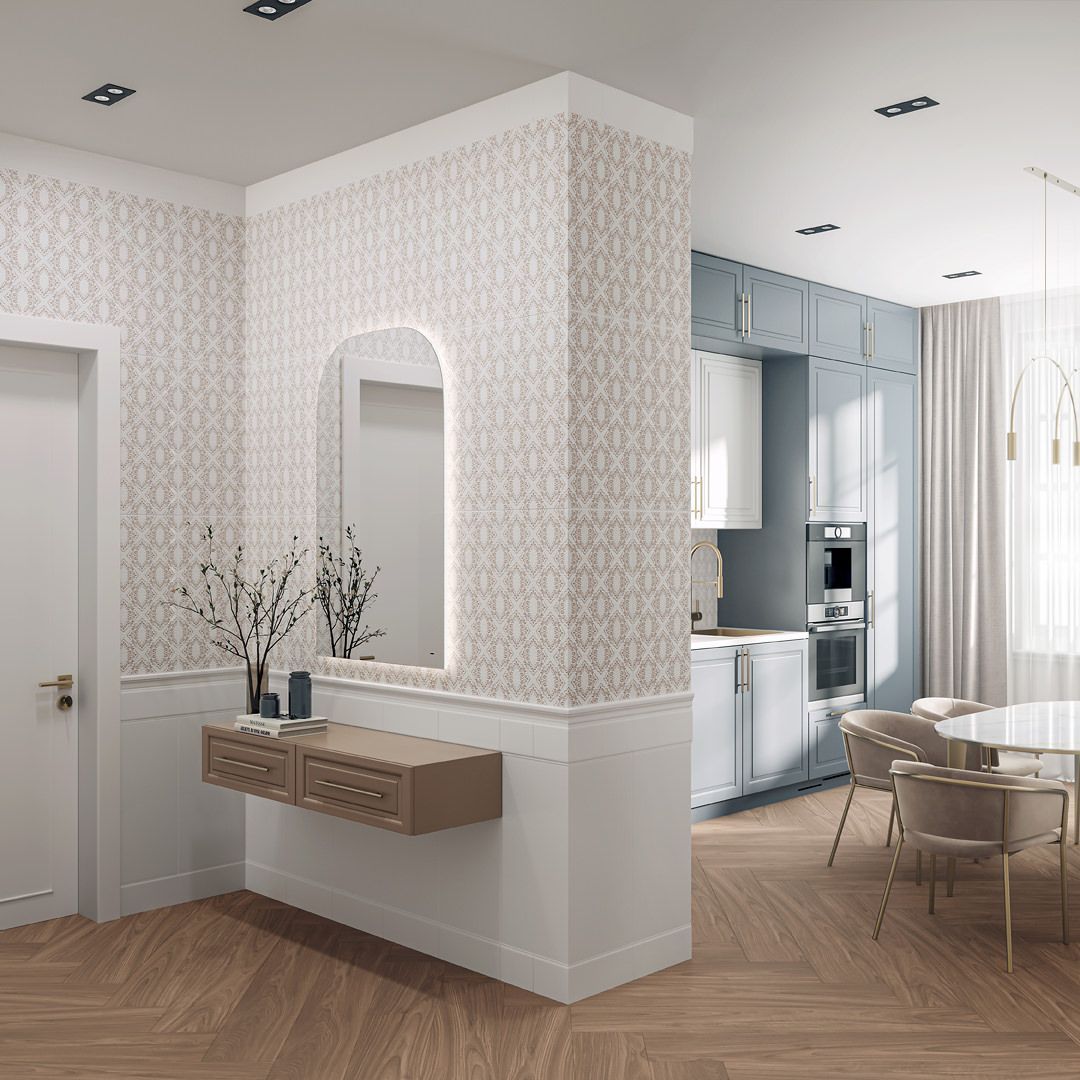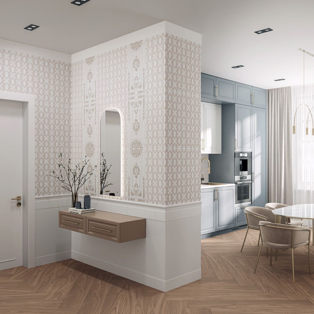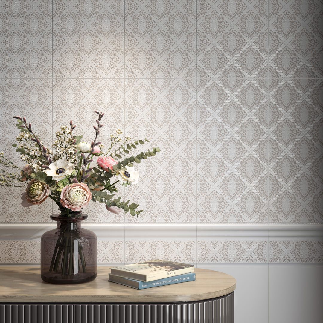 «Флориан» приглашает к созданию светлой отделки в традиционном стиле. Для этого серия предлагает ряд интересных решений, которые можно использовать в стилистике белых керамических обоев с читаемым объёмным рисунком на плитке 30х60: классический орнамент выполнен специальным составом в технике «белым по белому». Насыщенные узоры на декорах «Флориан» навеяны интерьерами одноименного кафе, расположенного на площади Сан-Марко с 1720 года.