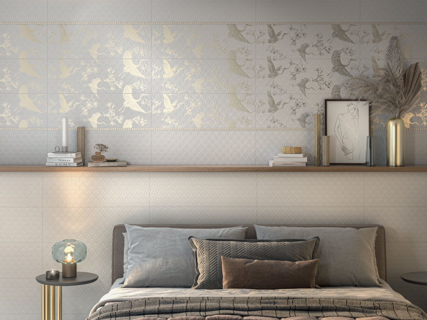 Элегантная плитка с птицами серии «Гарса» в двух оттенках — белый матовый и бежевый светлый — излучает шарм, золотистым контуром по плитке 25х75 см переданы изображения цветущих гибискусов или китайской розы и летящих журавлей. Графика выполнена в золоте. Поверхность плитки покрыта орнаментом пальметты, древним узором в виде веерообразных листьев пальмы, символизирующих солнце — жизненную силу. Изящно подчеркнуть рисунок помогут бордюры разной толщины, дополняющие серию.