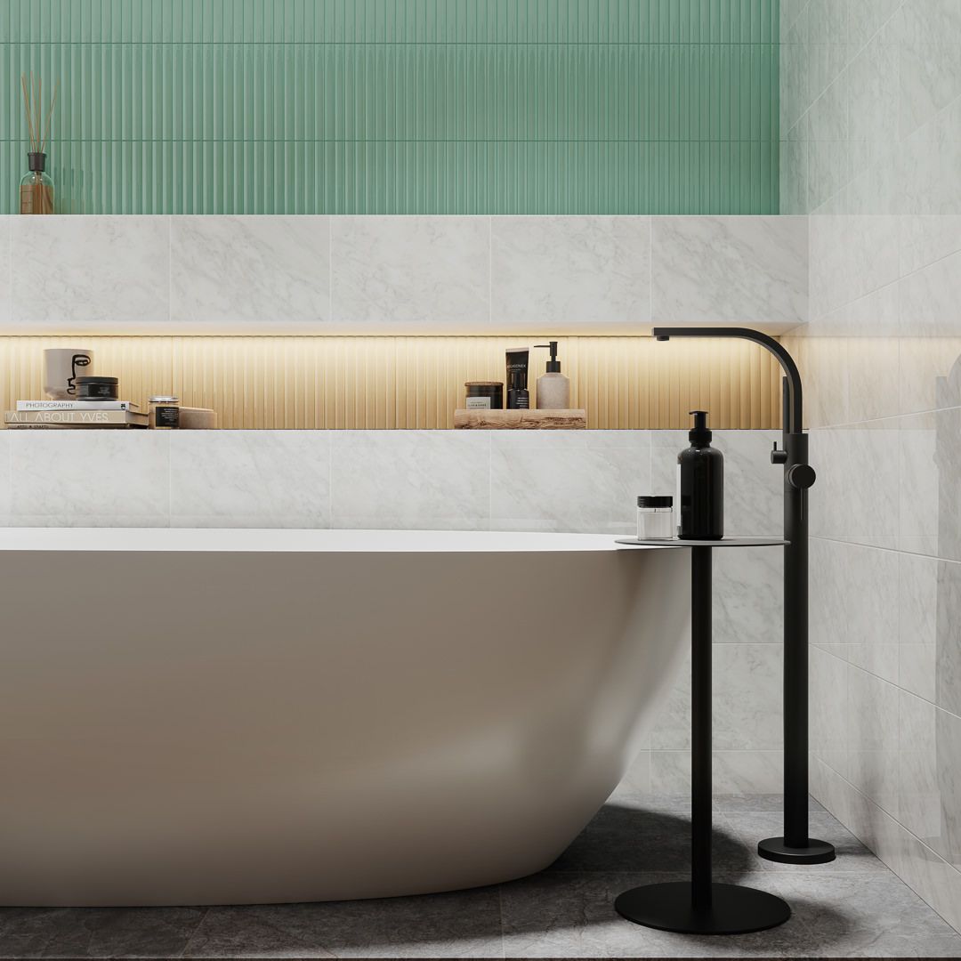 Графика серии «Каприччо» вдохновлена каррарским мрамором и выполнена с впечатляющей детализацией. В качестве палитры керамической плитки для стен выбраны одни из самых востребованных оттенков: белый, серый и коричневый. Керамогранит для пола выполнен в схожей гамме.