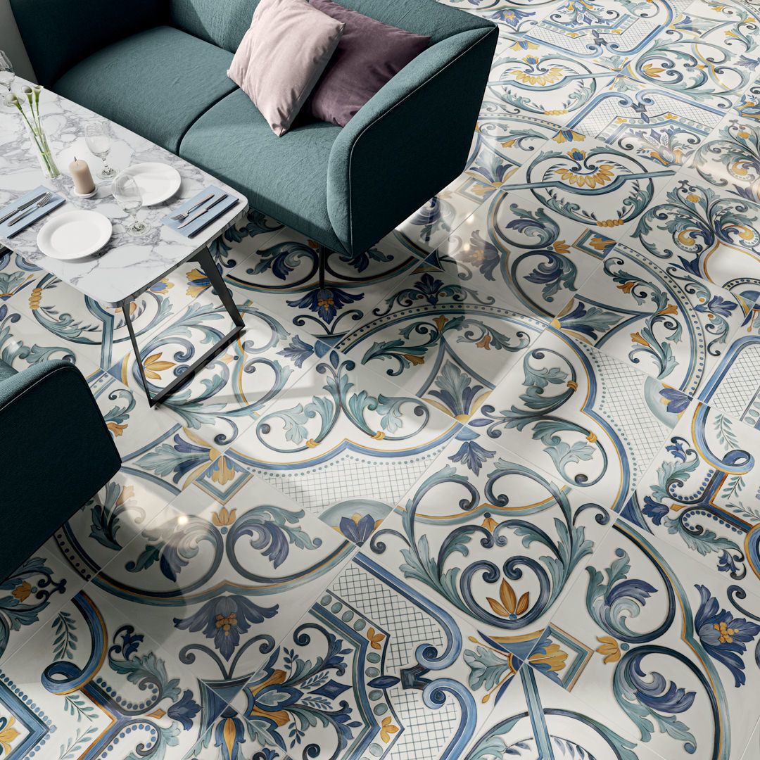 Такое же сочетание цветов — в декоративных элементах «Мирадоро». Декоры с авторским рисунком образуют пёстрый португальский ковёр в эстетике плитки азулежу, с рукотворными майоличными росписями. Глянцевая лаппатированная поверхность и насыщенный цвет узоров создадут ощущение праздника, краски которого не угаснут со временем.