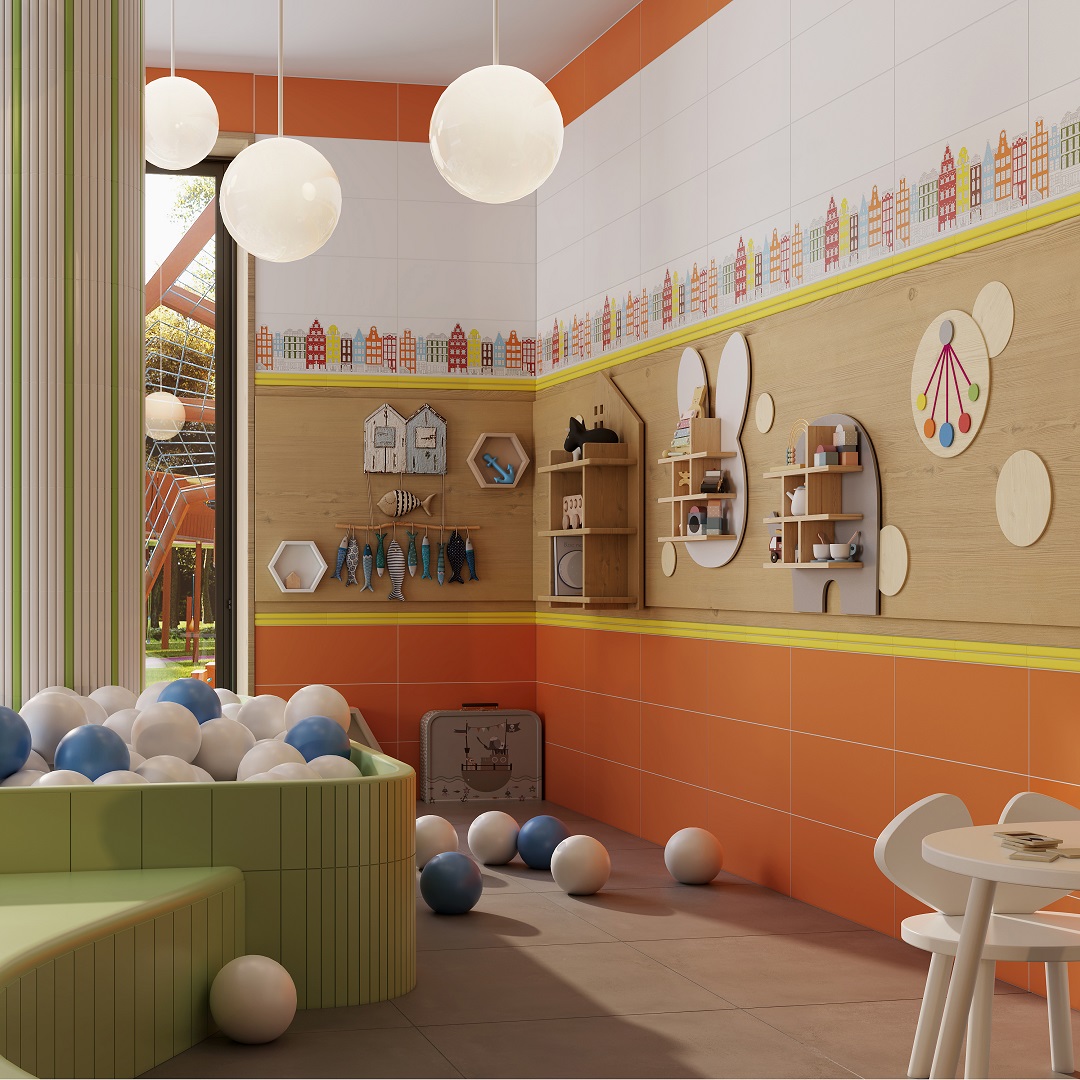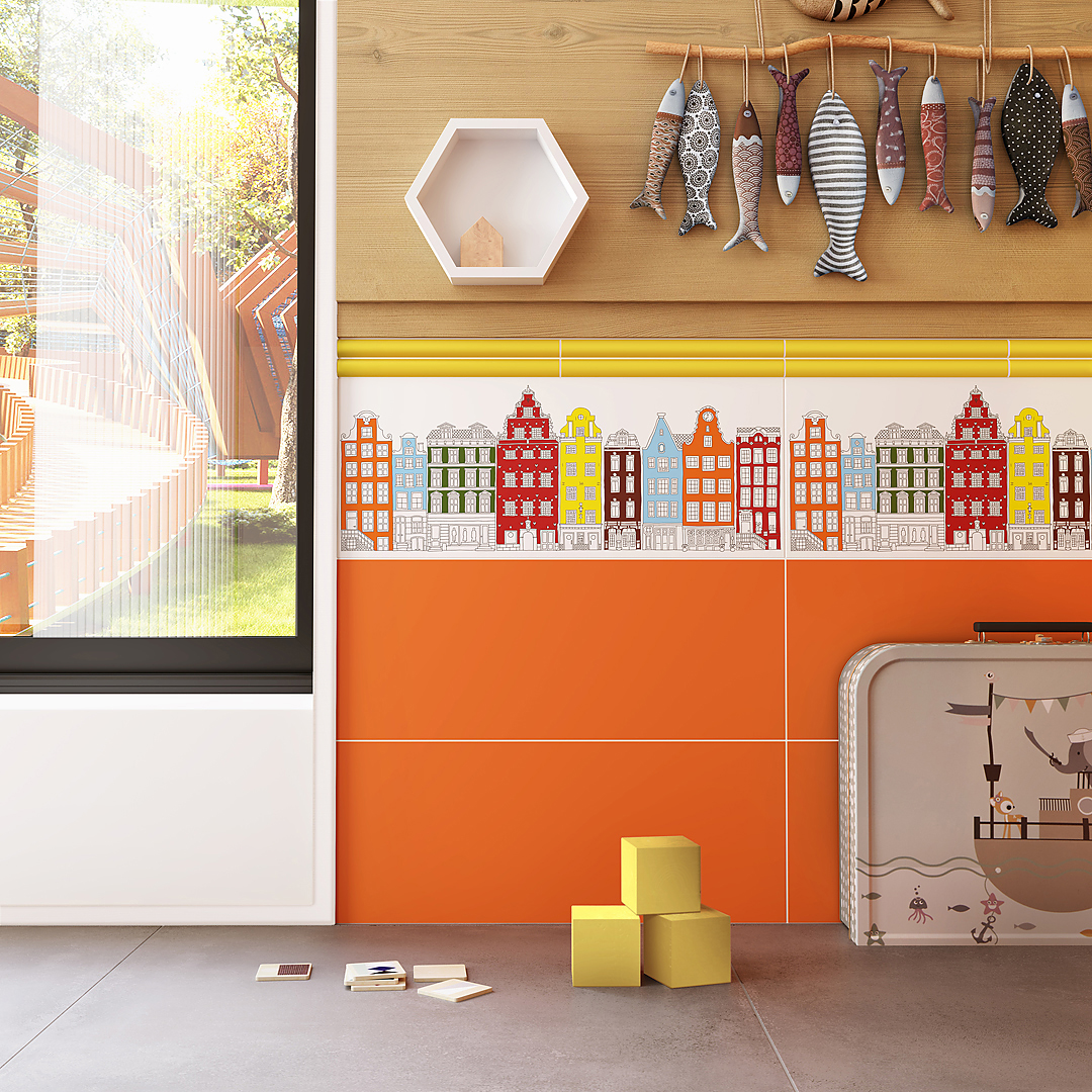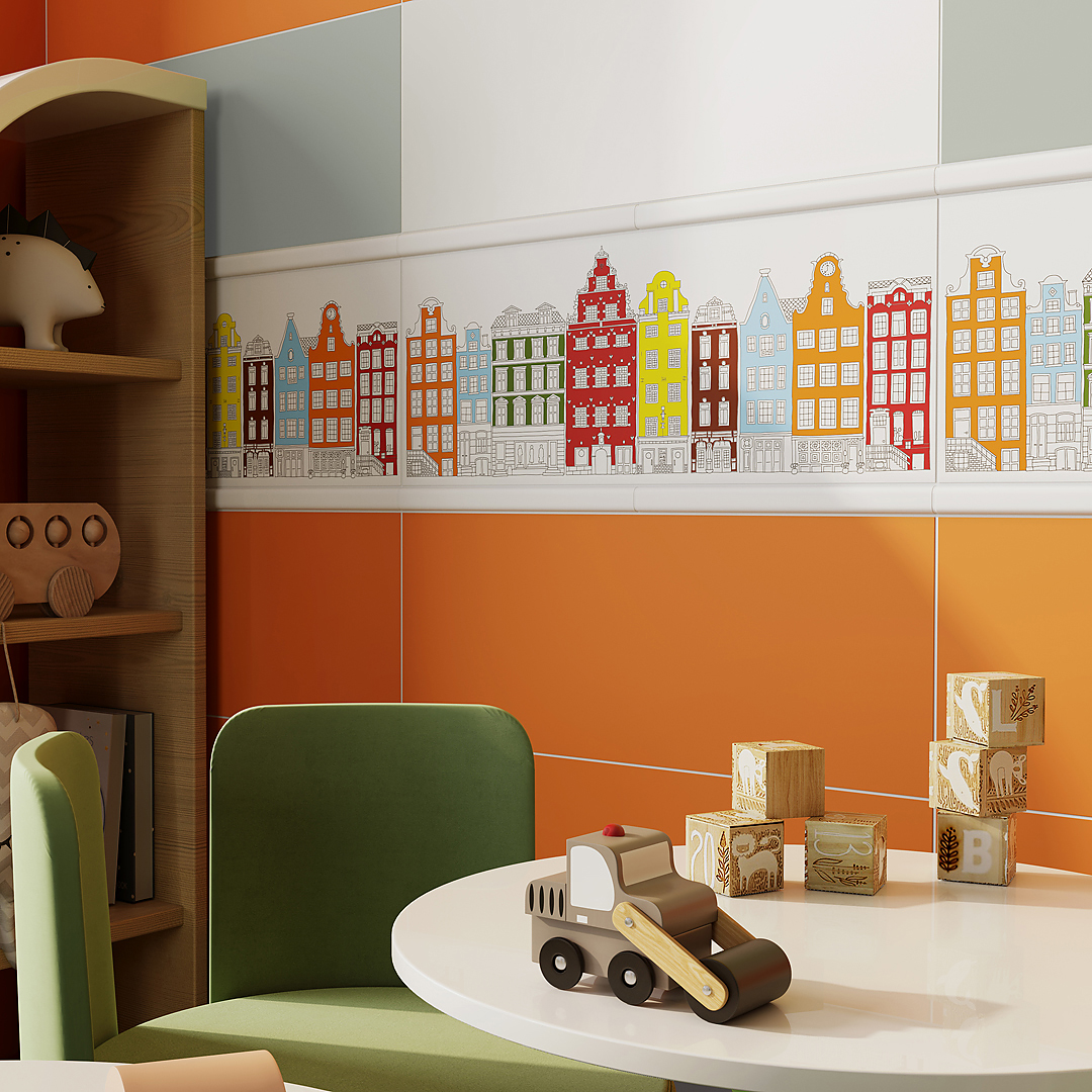 Матовый декор «Стокгольм» – причудливая линия скандинавских домиков, которые в керамической раскладке можно составить в длинный горизонтальный бордюр. Яркие краски и необычный стиль рисунка помогут придать любой керамической композиции новое звучание.