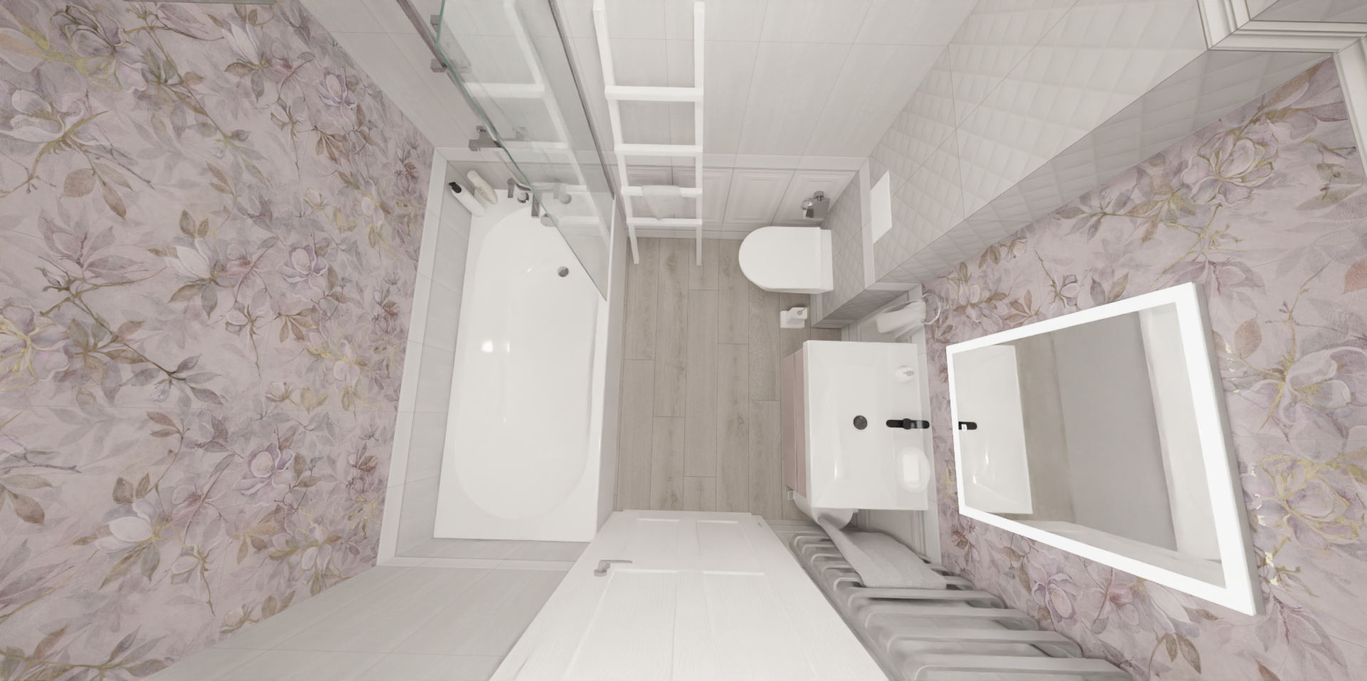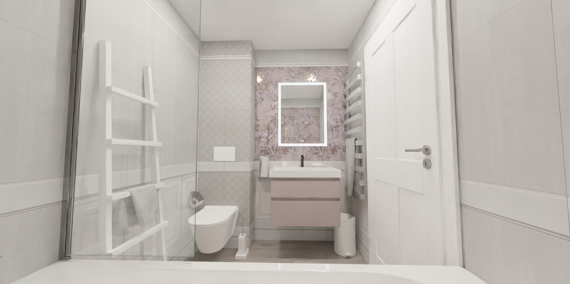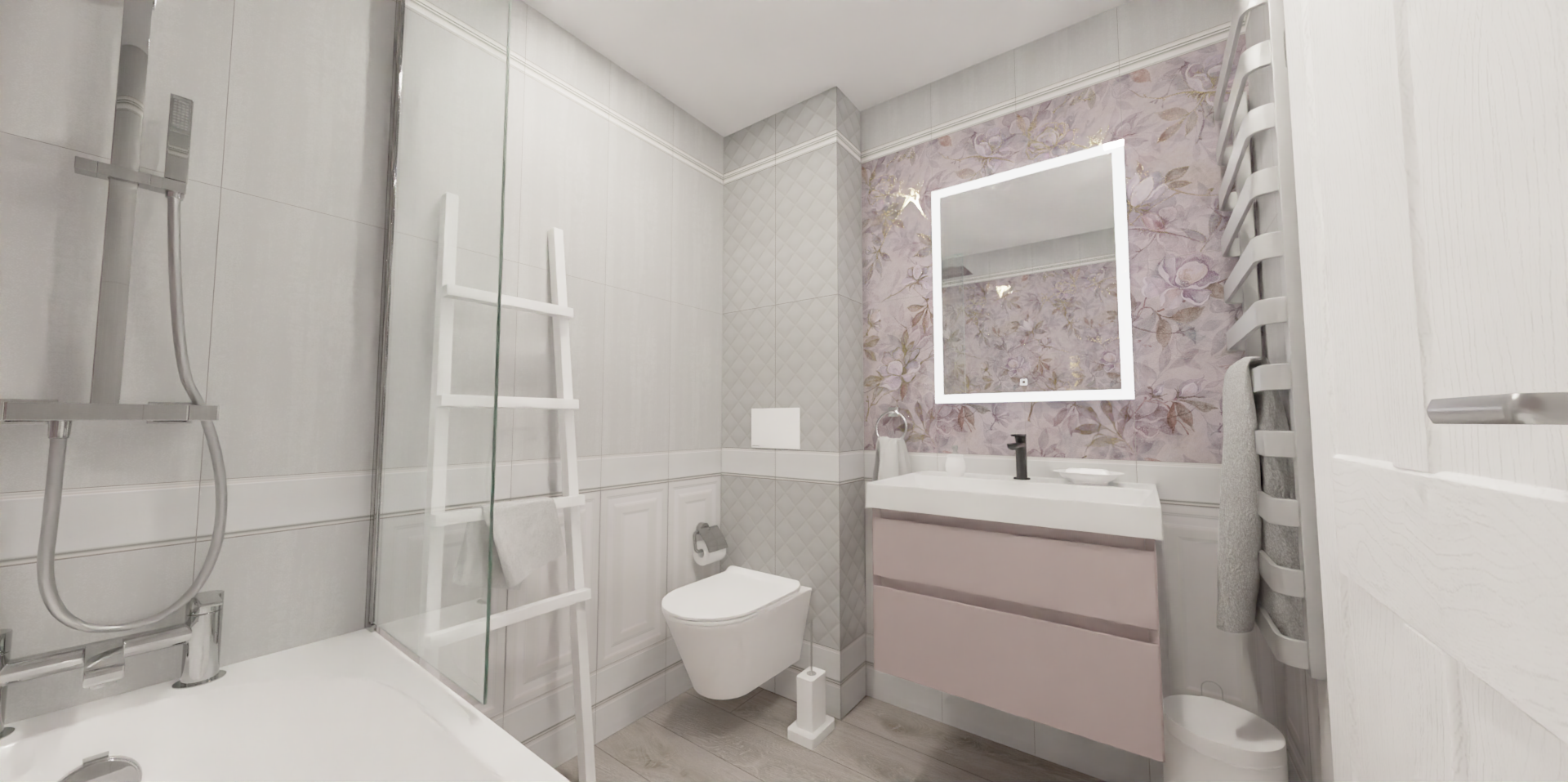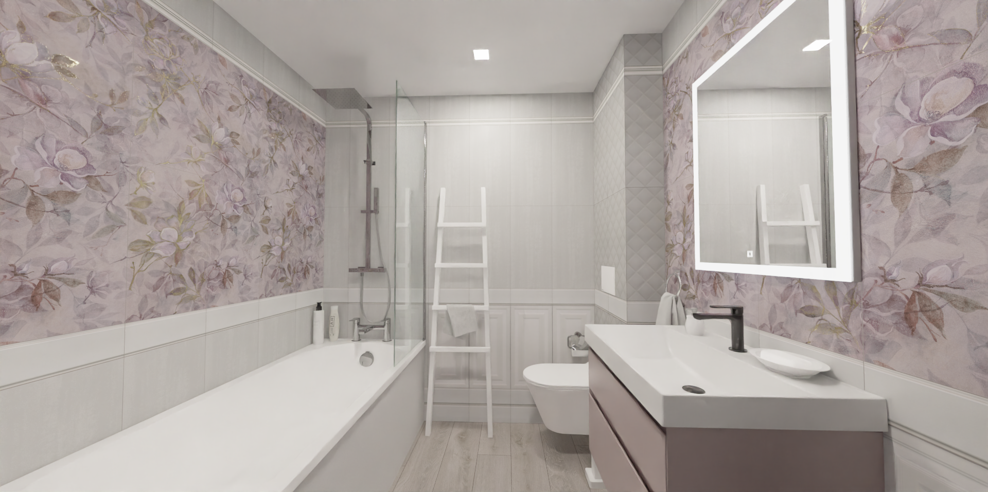 Это проект совмещенного санузла с элегантными и легкими цветочными мотивами в пастельных тонах. Стены облицованы плиткой из серии Магнолия.