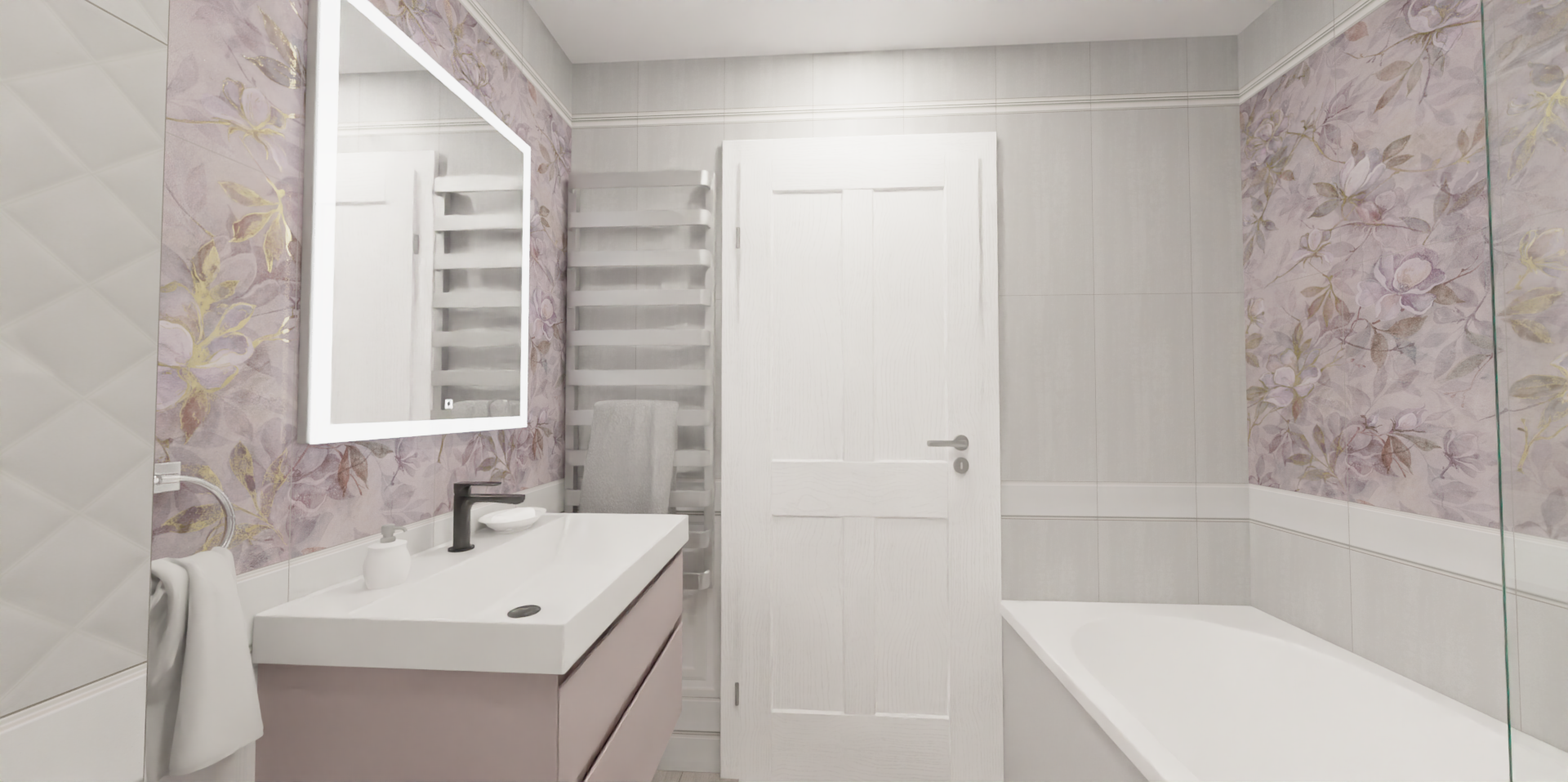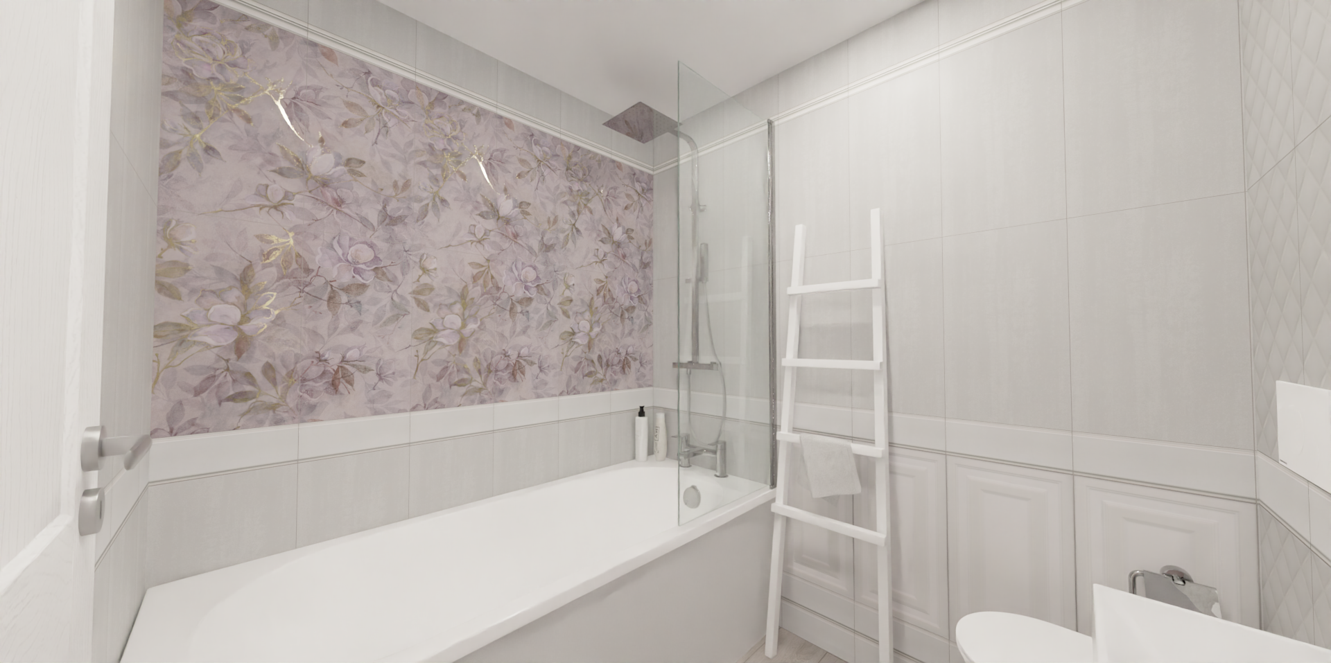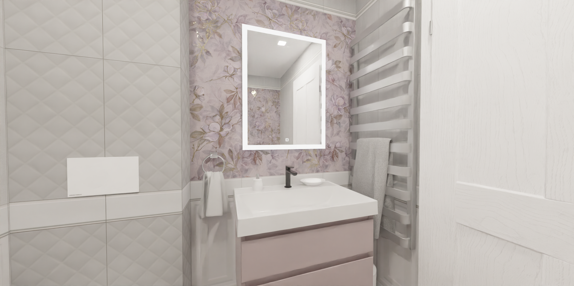 Нежная матовая серия с цветами магнолии дарит интерьеру гармонию и красоту. Белая плитка смотрится оригинально и интересно благодаря структуре классической панели буазери и структуре каретной стяжки. Акцентная стена у ванной украшена необыкновенным нежно-сиреневым панно, создающим эффект керамических обоев.