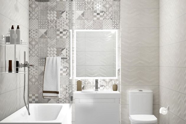 Акцентная стена за зеркалом украшена декором Онда в стиле пэчворк. Светло-серая плитка с геометрическими и цветочными орнаментами напоминает лоскутное одеяло и создает ощущение уюта. Остальные стены облицованы фоновой плиткой Онда с волнообразной структурой. Матовая плитка с эстетикой бетона покрыта объемным геометрическим узором в виде волн.