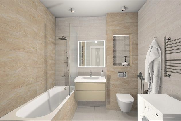 Глянцевая плитка Эвора большого формата 30x60 уложена горизонтально, что визуально расширяет пространство. Помещение совмещенного санузла зонировано с помощью двух оттенков бежевого. Стена за ванной украшена плиткой с геометрическим рисунком, а ниши декорированы нарезной мозаикой. Пол облицован керамическим гранитом Эвора в формате 60x60.