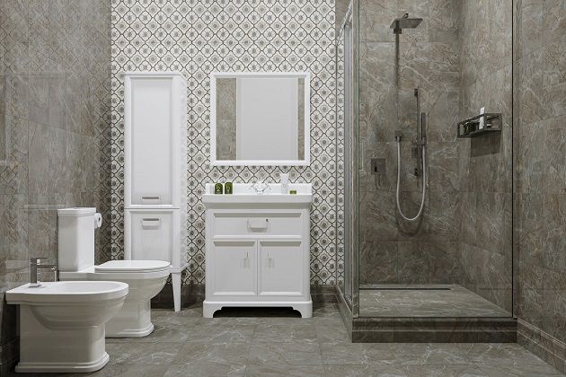 Классический проект санузла в нейтральных серых тонах с красотой мрамора выполнен с помощью керамики, сантехники и мебели от KERAMA MARAZZI.
