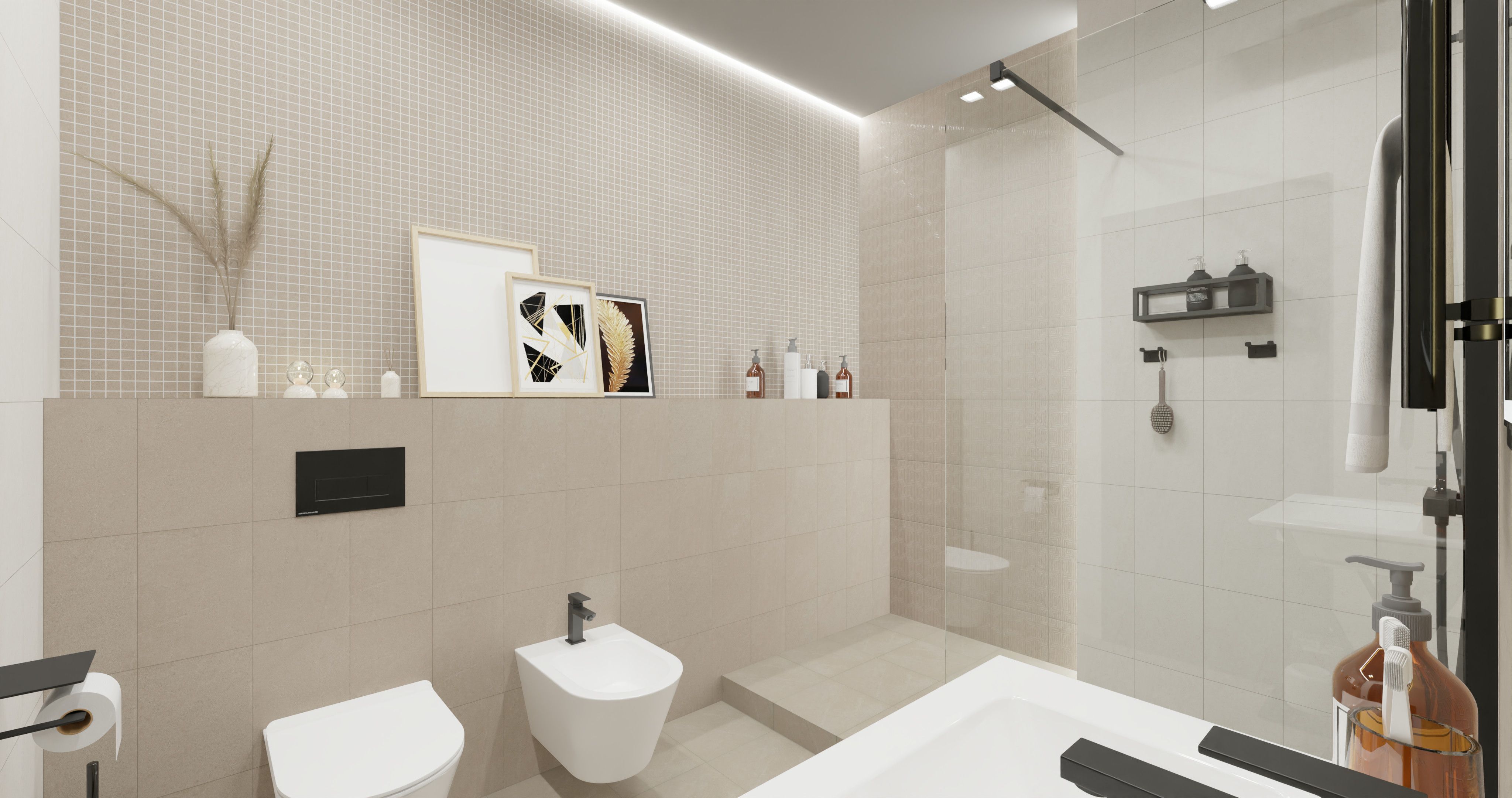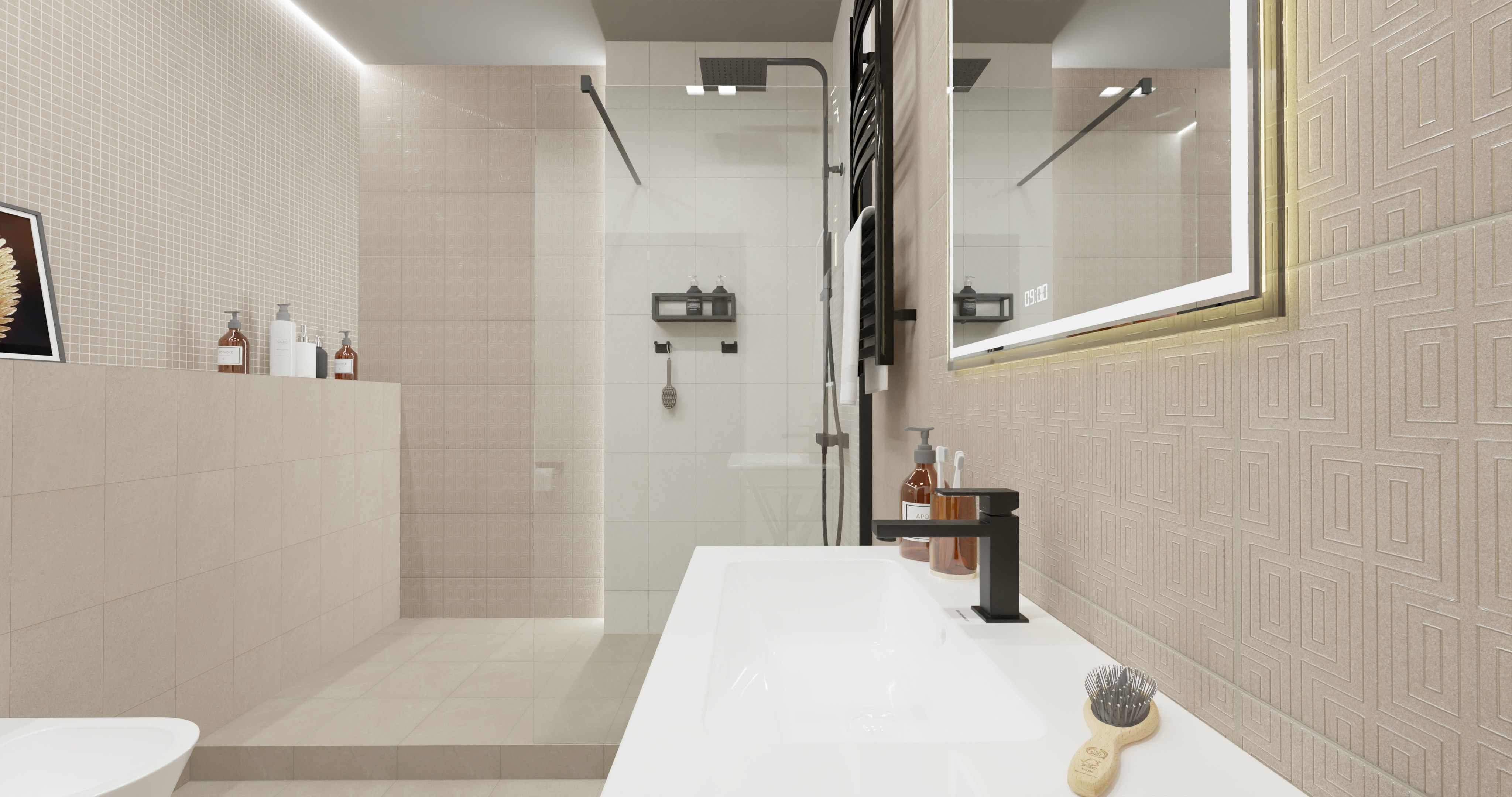 Интерьер выполнен в бежевых тонах с эстетикой камня - отличное решение для обстановки, располагающей к спокойствию, обретению равновесия и душевной гармонии. Стены облицованы керамической плиткой формата 20х30 серии Матрикс в двух оттенках бежевого. Оживляют раскладку два вида декоров: мозаичный и с геометрическим орнаментом. На пол уложен керамический гранит Матрикс 30х30. Керамогранит с эстетикой камня идеально сочетается с цветом и фактурой настенной плитки.