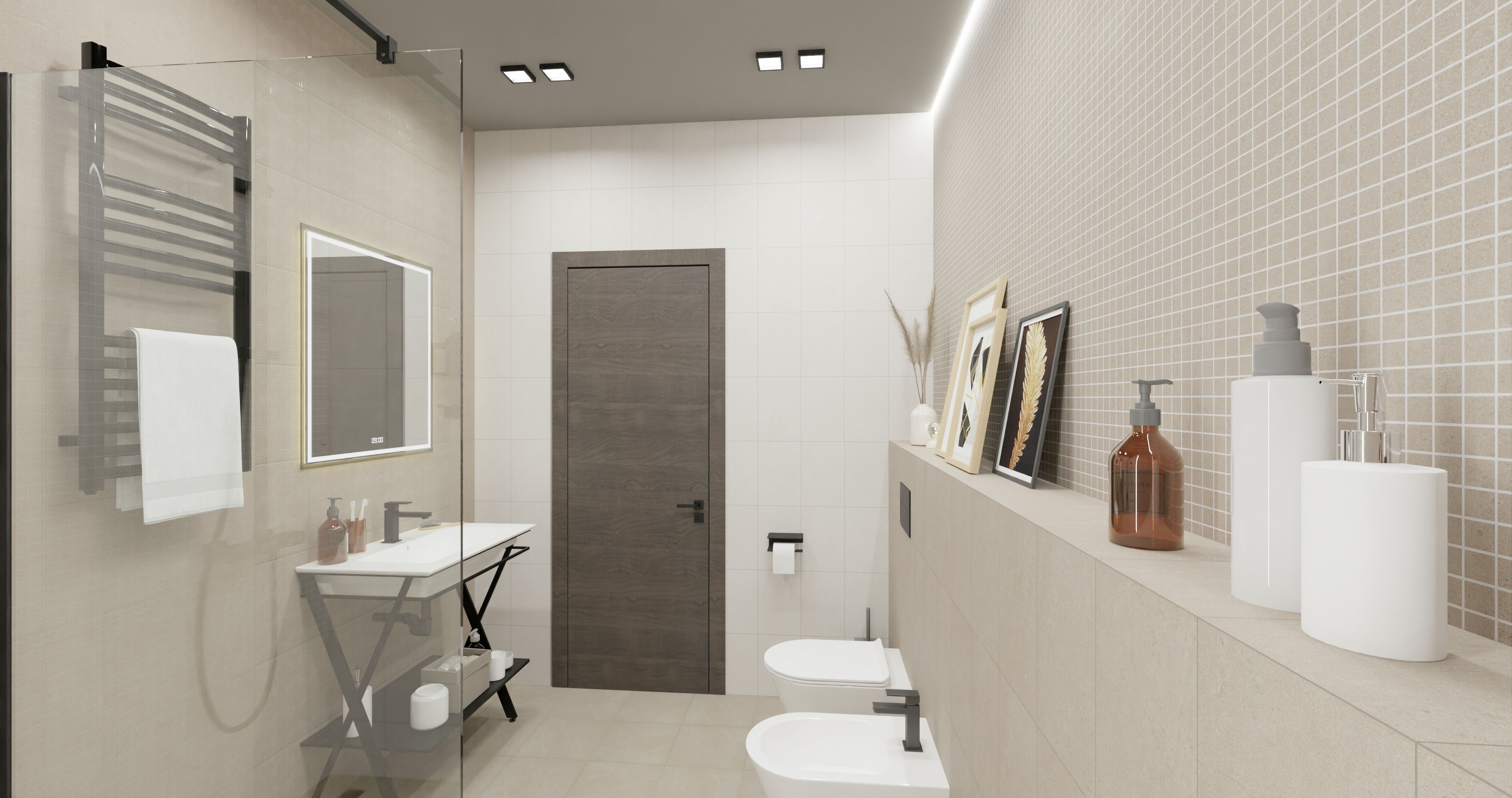 Лаконичная ванная комната в современном стиле с эстетикой металла и мозаичным декором.