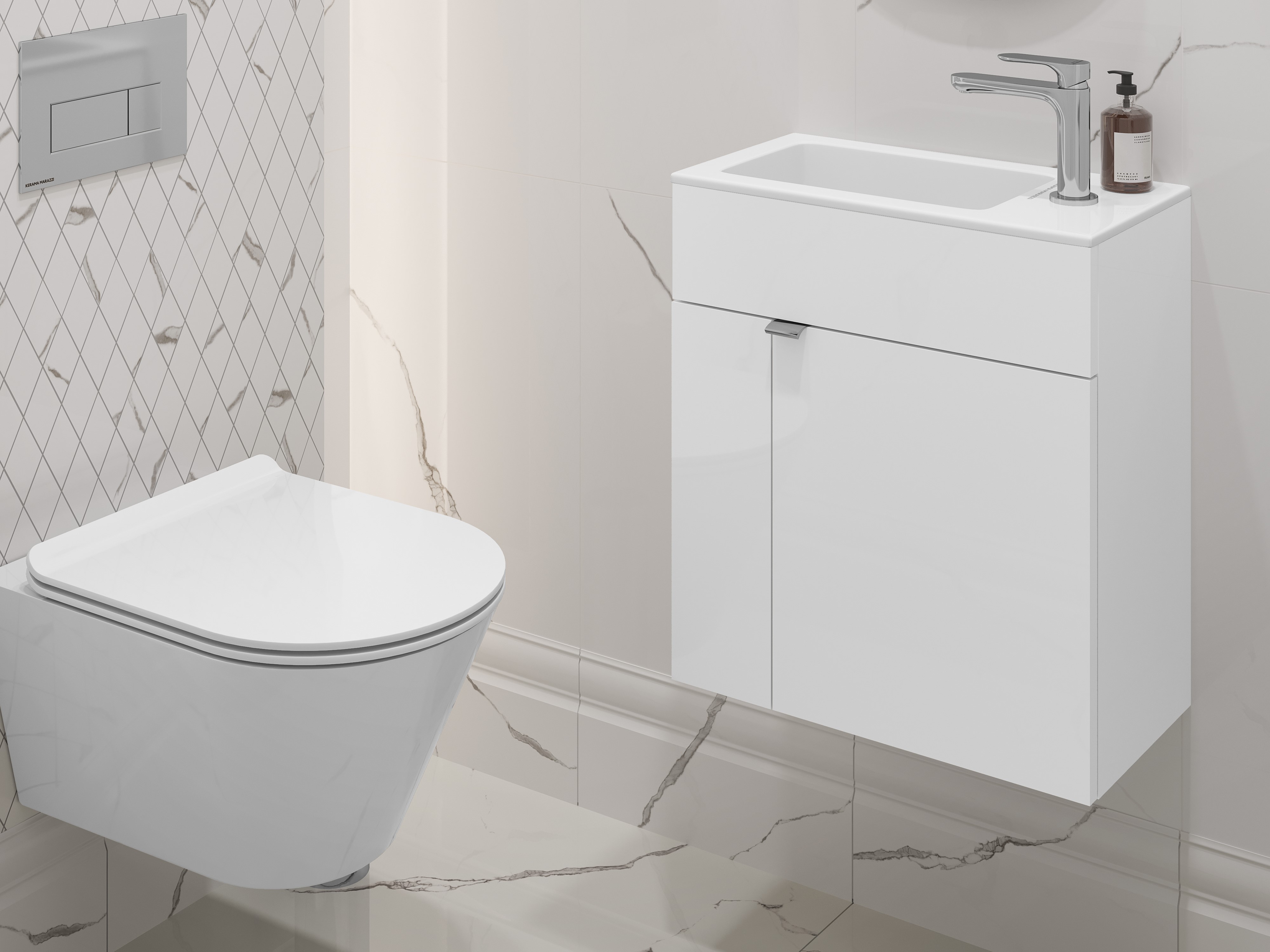 Эта туалетная комната, оформленная с изысканным вкусом, встречает своей утончённой красотой. Благодаря сантехнике, керамике и мебели от KERAMA MARAZZI мы создали не просто функциональное пространство, но и настоящее произведение искусства, которое радует глаз и дарит ощущение уюта.