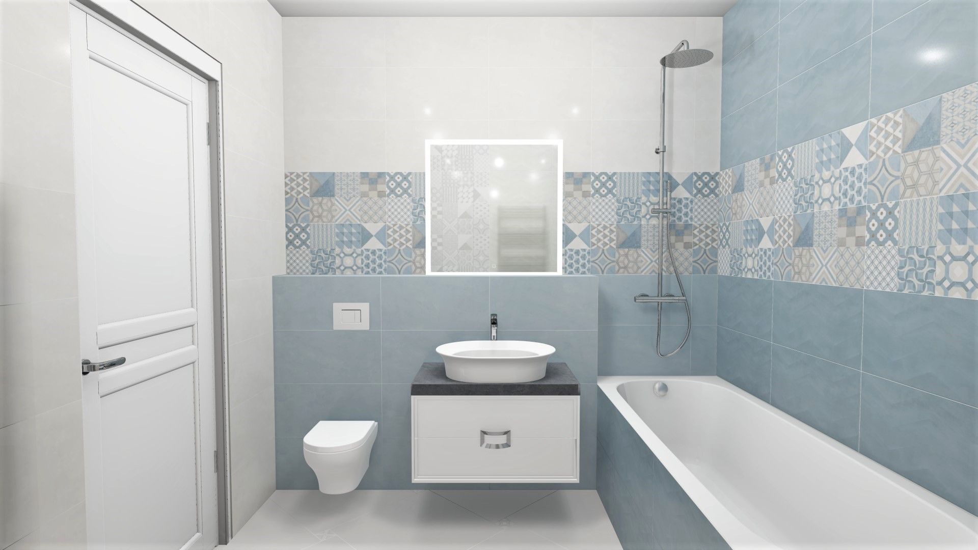 Это современный интерьер ванной комнаты в светлых тонах. Интерьер стильный, но при этом дает ощущение домашнего уюта. Декоры Онда в стиле пэчворк напоминают теплое лоскутное одеяло и создают уютную атмосферу.