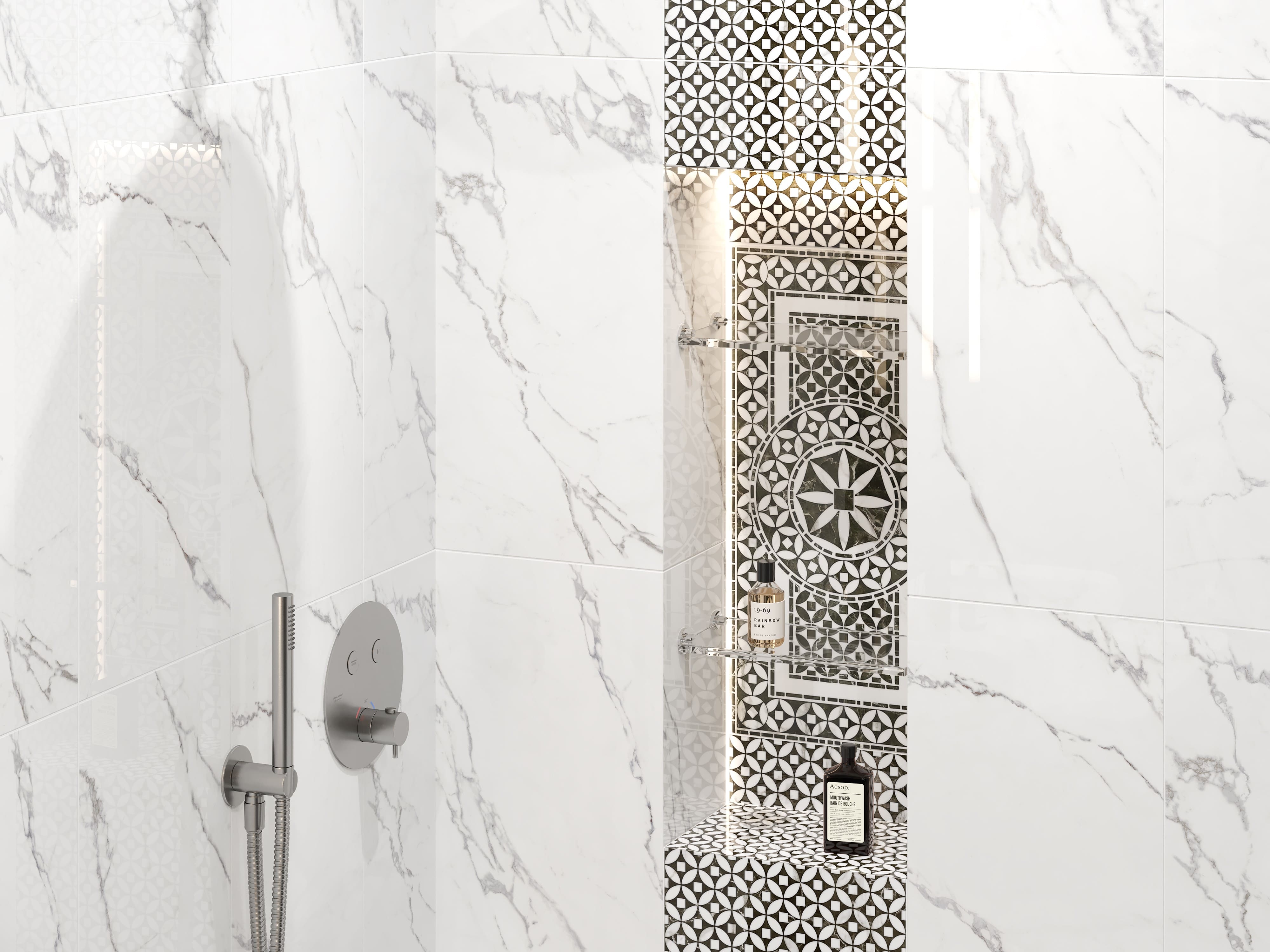 Этот интерьер ванной комнаты сочетает в себе элегантность классического стиля и функциональность современных решений. Визуально помещение поделено на две зоны с помощью дуэта черного и белого мрамора.