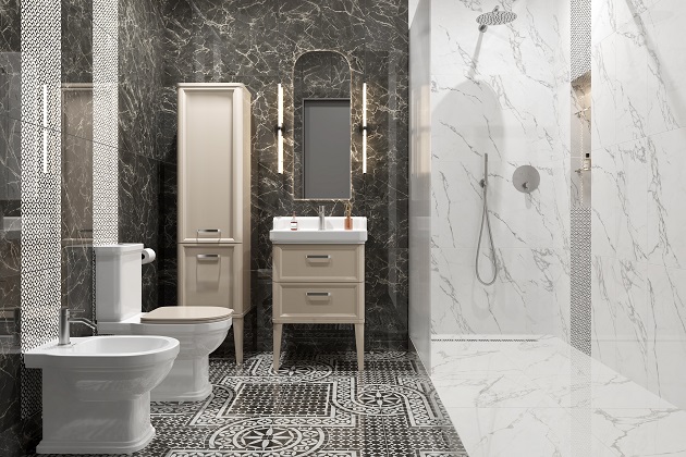Стильный санузел с эстетикой камня и античной мозаики