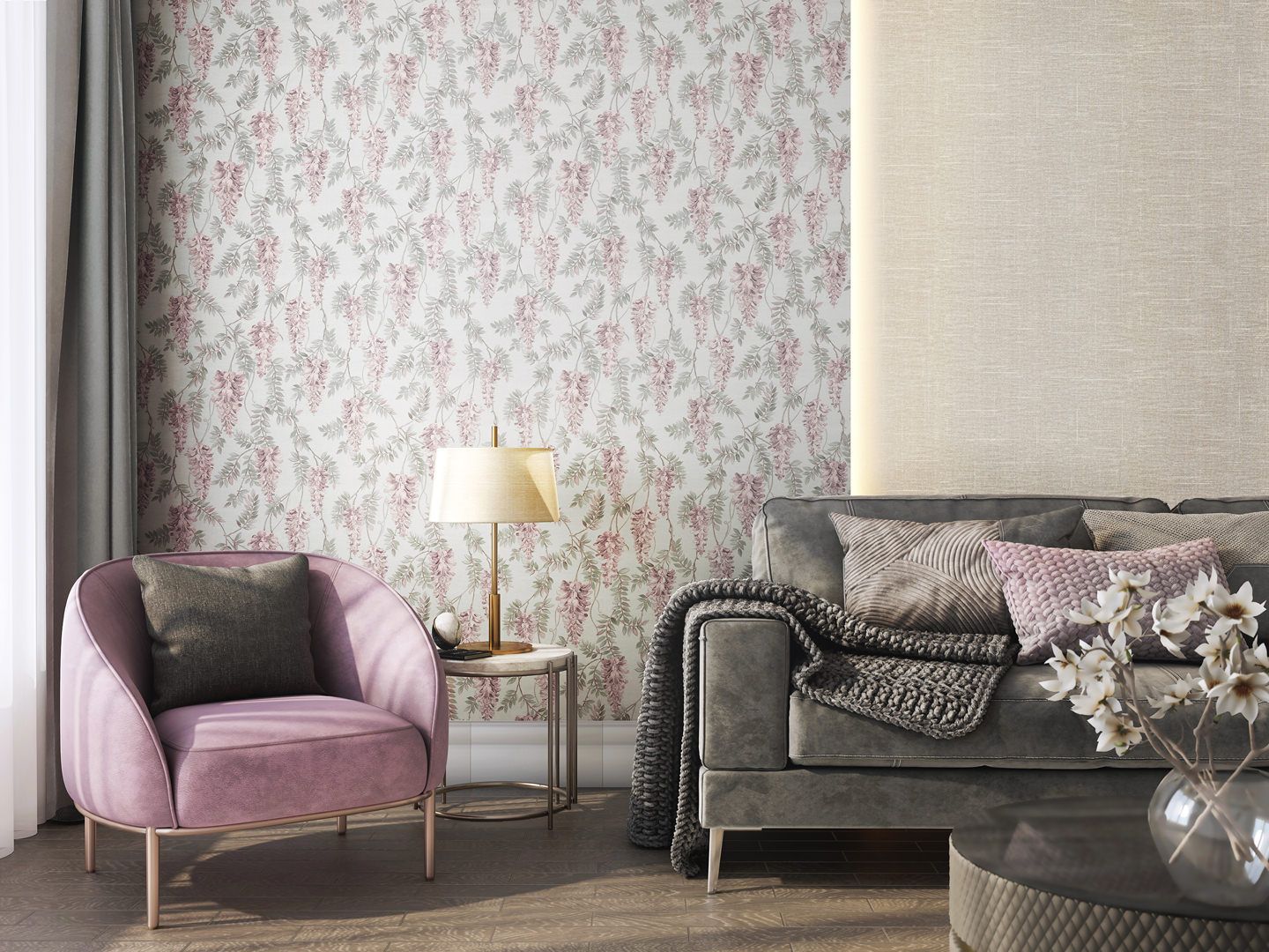 Серия «Эдем» предлагает сразу два подхода к флористической теме в интерьерах. Первый вариант мотива украшен изображениями глициний, чья красота усилена тиснением и сдержанным блеском – он достигнут благодаря особой технологии печати.