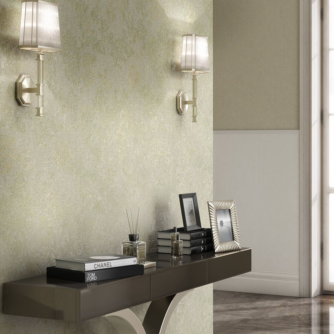 Декоративное напыление золотом и серебром придаёт обоям блеск, привносит интересную игру света.