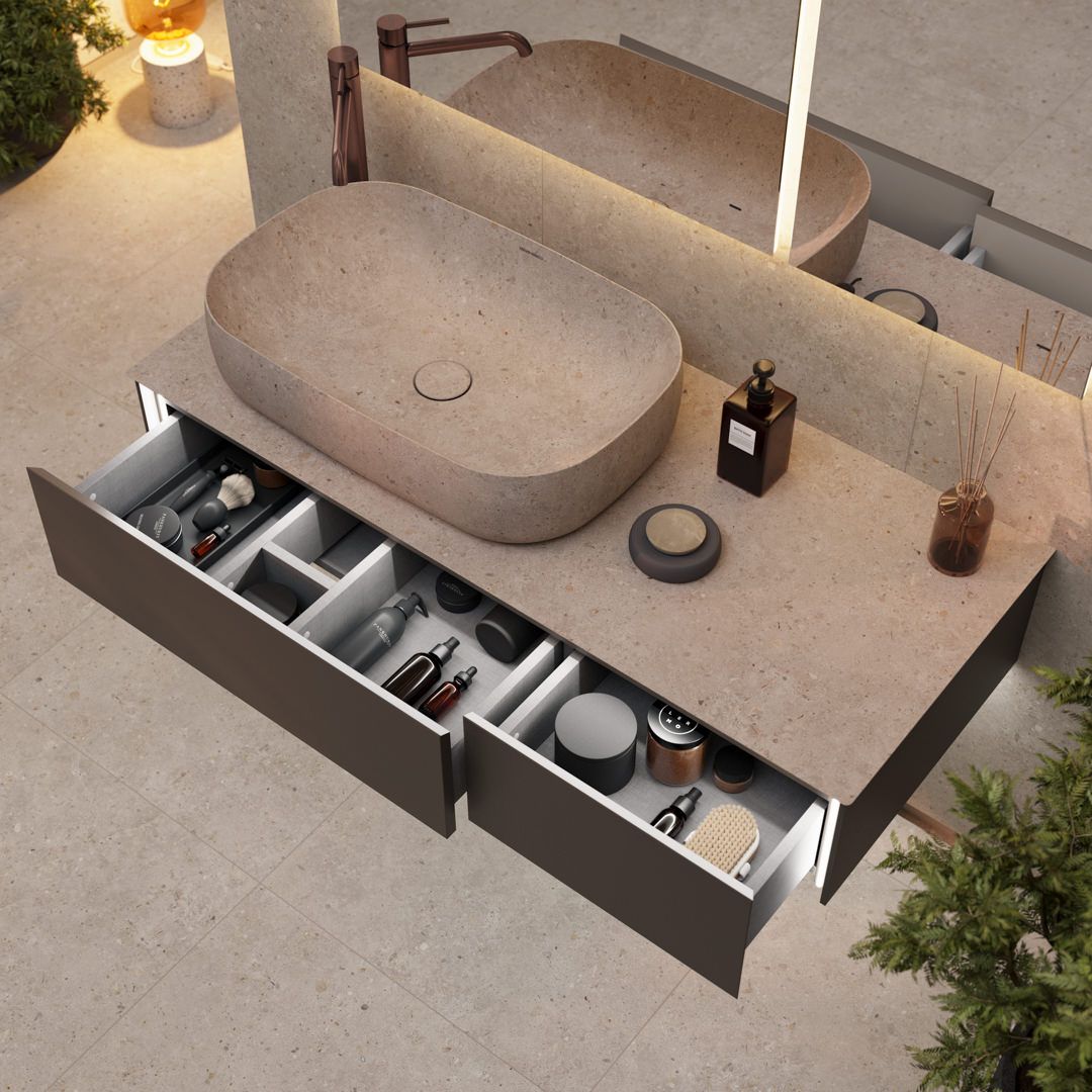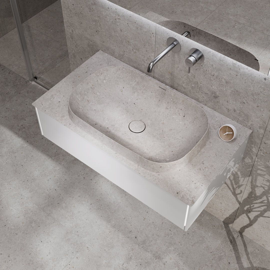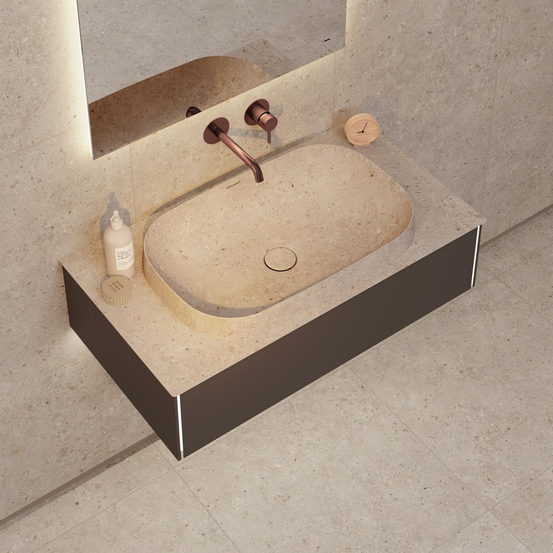 Серия содержит раковины с эффектом камня: они выполнены по уникальной технологии, которая гарантирует полную надёжность покрытия и позволяет добиться полного соответствия матовой поверхности со столешницей, а также настенной и напольной плиткой «Риккарди» — для создания на 100% скоординированного интерьера. В комплект с такими раковинами входит донный клапан, соответствующий по цвету.