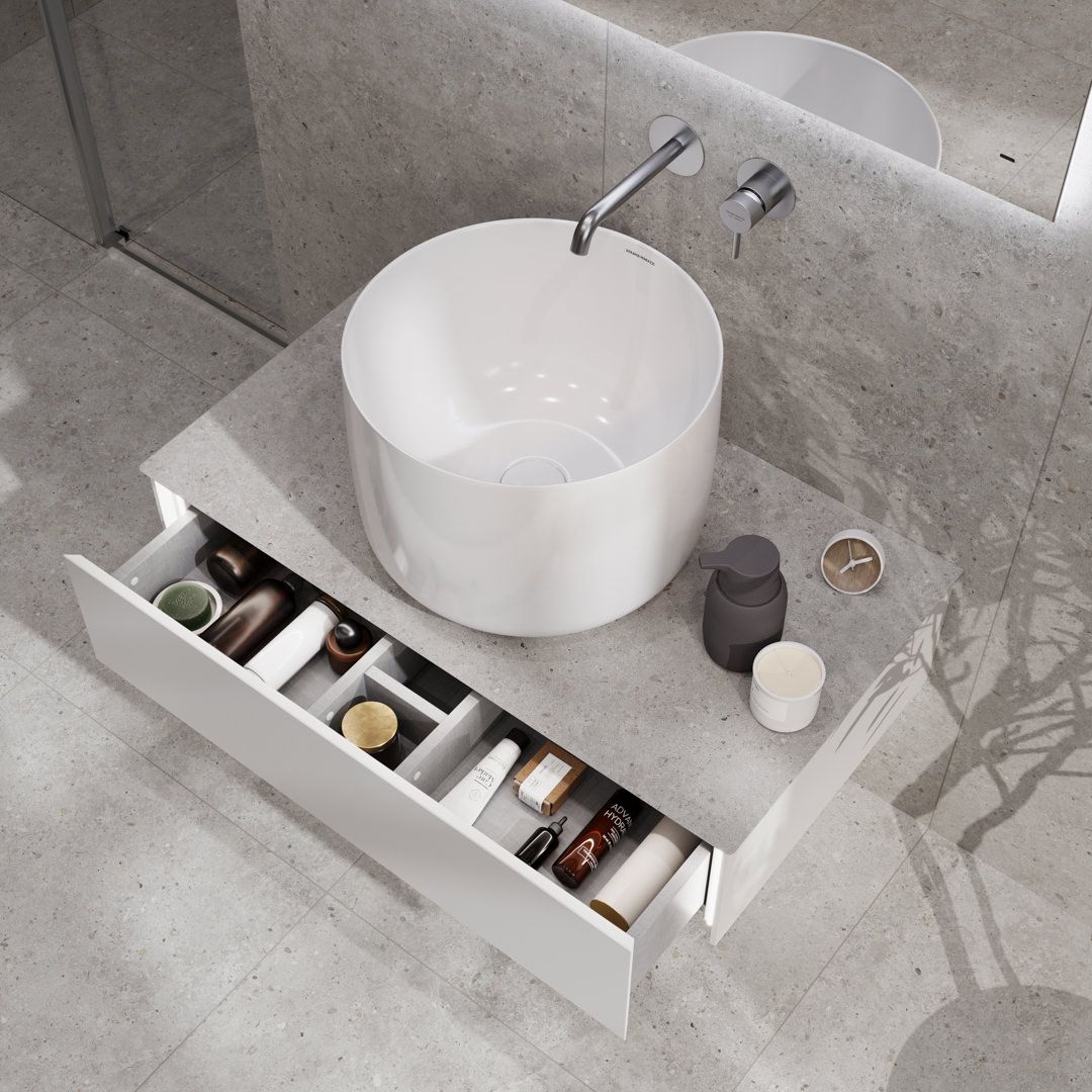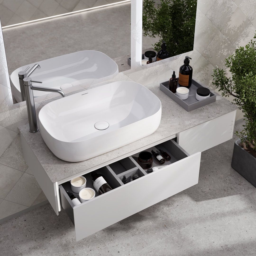 В серию Маджика также входит раковина высотой 305 мм в белом глянцевом цвете. Раковина подобной высоты впервые представлена в ассортименте KERAMA MARAZZI и уникальна для рынка. Помимо этой, предложены и более привычные модели: накладная и встроенная сверху, обе шириной 65 см.