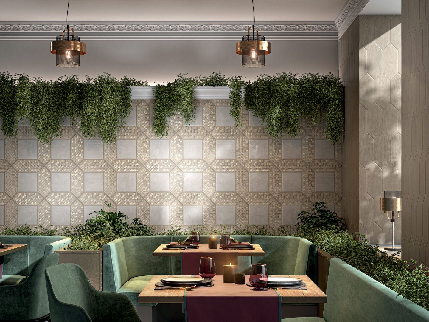 Используя декоры и вставки, можно получить множество интересных вариантов керамического покрытия для разных помещений. Так, новые шестиугольники будут хорошим решением для тех, кто ищет бежевую плитку для фартука на кухне. В качестве плитки для ванной «Монтиш» в том числе применяют с керамическими квадратами 20х20 — например, из серии «Понти».