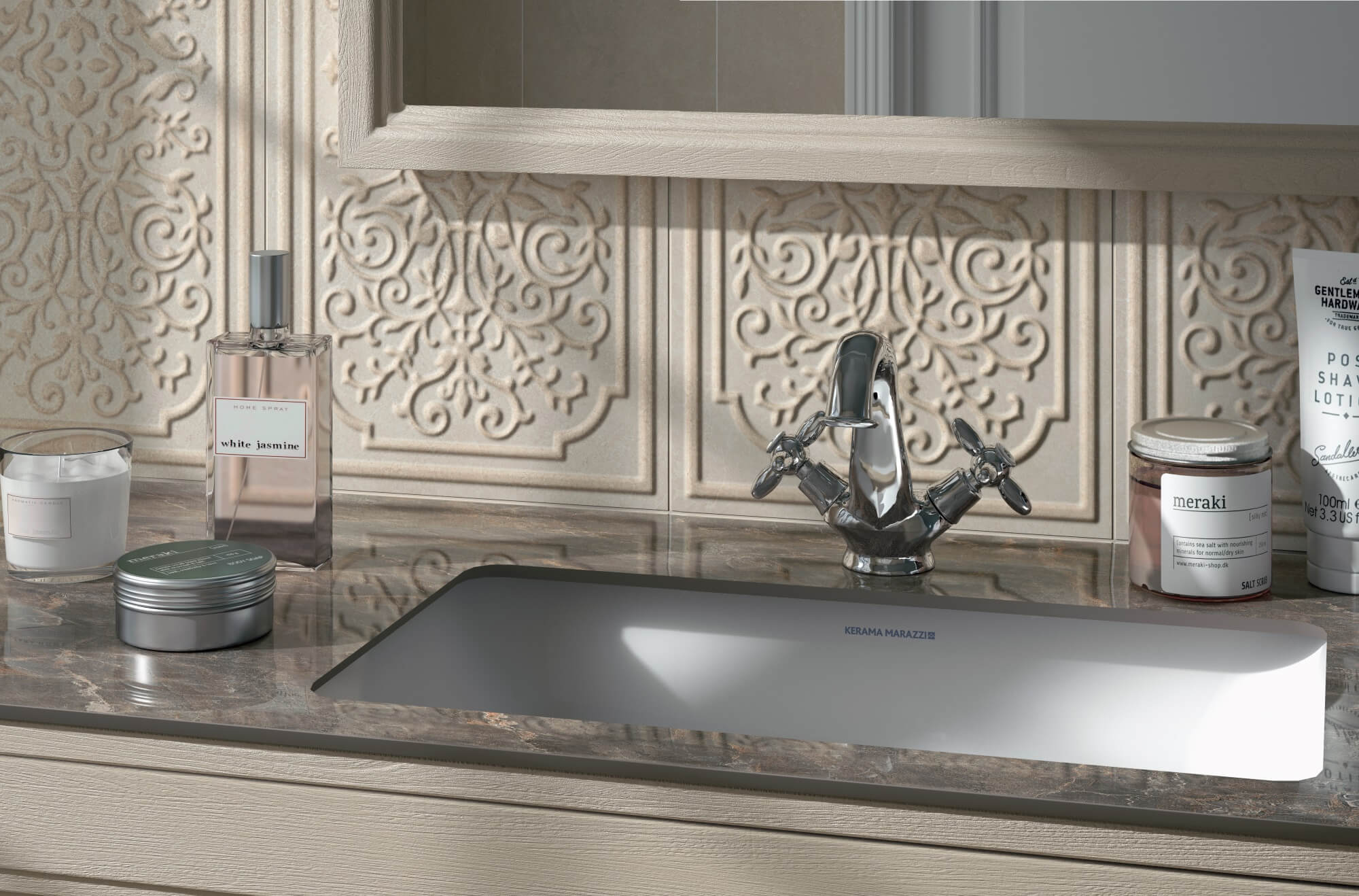 Серия «Муза», благодаря своему ретро стилю, позволяет воссоздать в интерьере атмосферу барочных времен, но в современном прочтении. Вневременная элегантность придаёт ей оттенок богатства и шика. Душевые лейки с плавными округлыми линиями внешне походят на телефонные трубки начала 20 века. А на керамических вставках на вентилях витиеватым шрифтом указана температура воды. Муза — eдинственная серия в ассортименте KERAMA MARAZZI, где представлены смесители с двумя вентилями. Для тех, кому потёртая бронза покажется слишком смелой, предлагаются аналогичные хромированные модели.