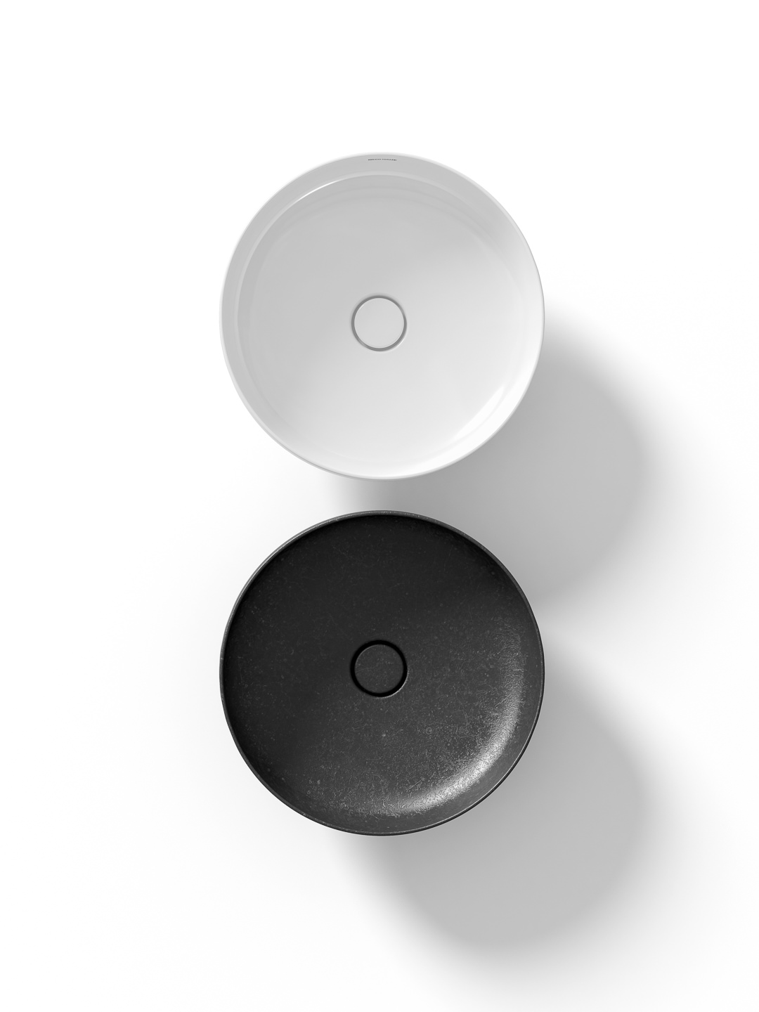 Контуры Сафи задают изящная ножка и широкая чаша, очень вместительная и удобная. Ножка приподнимает чашу от столешницы, визуально облегчая композицию. Раковина Сафи в цветах «чёрный камень» и белом глянце может использоваться вместе с тумбами Караван и Маджика шириной 90 и 120 см.